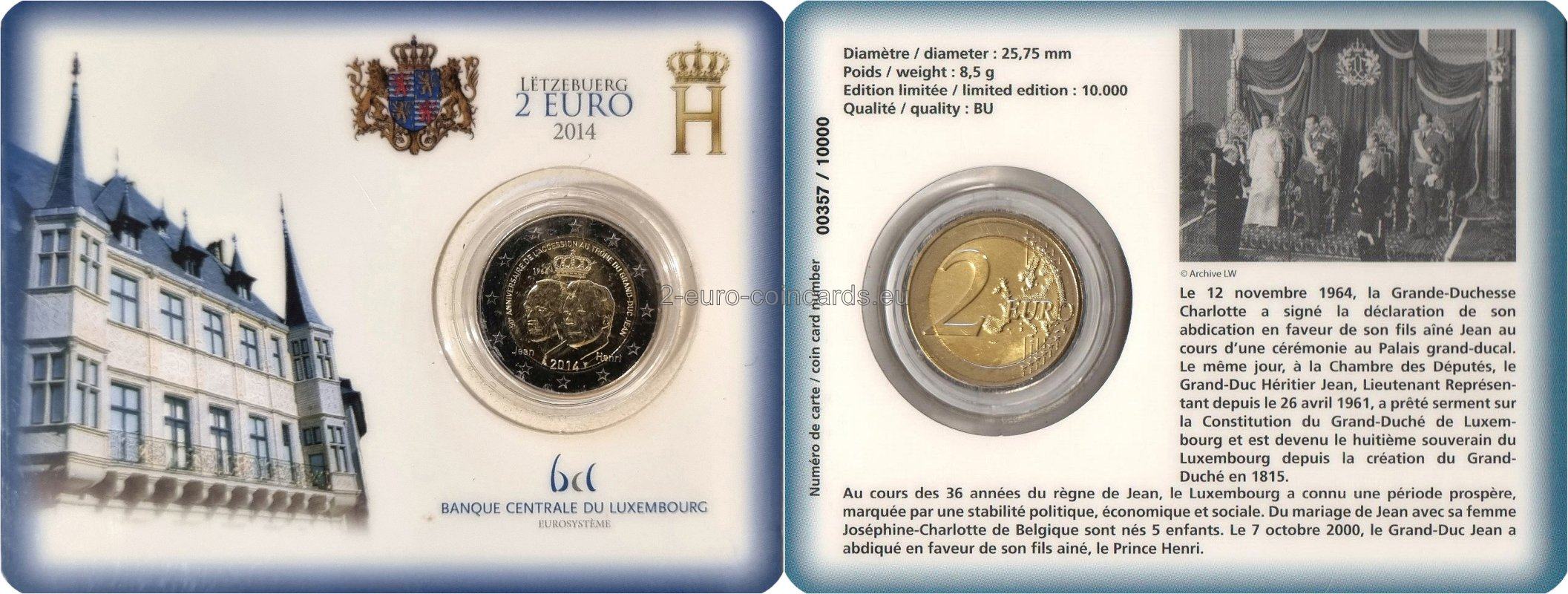 Na vnútornej časti mince sú vyobrazené podobizne ich kráľovskej výsosti, veľkovojvodu Henricha a veľkovojvodu Jána, obaja hľadia doľava. Nad podobizňou veľkovojvodu Jána je uvedený rok „1964“ a nad obidvoma je vyobrazená koruna. V spodnej časti sú uvedené mená „Jean“ a „Henri“ pod príslušnými podobizňami a rok „2014“ umiestnený medzi značkami Kráľovskej holandskej mincovne v Utrechte (Merkúrova palica) a značkou jej riaditeľa (Maarten Brouwer, plachetnica). Nápis „50e ANNIVERSAIRE DE L’ACCESSION AU TRÔNE DU GRAND-DUC JEAN“ (50. výročie nástupu veľkovojvodu Jeana na trón) obopína hornú vnútornú časť mince v kruhovom tvare.