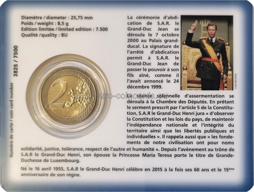 Na minci sú zobrazené podobizne ich kráľovských výsostí veľkovojvodu Henricha a veľkovojvodkyne Márie Terézie, nad nimi je uvedený rok nástupu na trón „2000“, vydávajúca krajina „Luxembourg“, ako aj rok výročia „2015“. V spodnej časti mince je nápis „15e anniversaire de l’accession au trône de S.A.R. le Grand-Duc“ (15. výročie nástupu jeho kráľovskej výsosti veľkovojvodu na trón). Pod ním je znak riaditeľa Holandskej kráľovského mincovne v Utrechte (Maarten Brouwer, plachetnica, vľavo) a znak samotnej mincovne (Merkúrová palica).