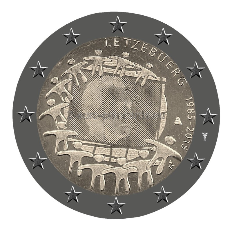 Vzor zobrazuje vlajku EÚ ako symbol, ktorý spája ľudí a kultúry s rovnakými víziami a ideálmi lepšej spoločnej budúcnosti. Dvanásť hviezd, ktoré sa menia na ľudské postavy, predstavuje zrodenie novej Európy. Vpravo hore je v polkruhu uvedený názov vydávajúcej krajiny „LËTZEBUERG“ a roky „1985 – 2015“. Vnútri obrazu vlajky je portrét veľkovojvodu Henricha. Vpravo dolu sa nachádza iniciála umelca Georgiosa Stamatopoulosa (ΓΣ), nad ňou značka riaditeľa Kráľovskej holandskej mincovne v Utrechte (Maarten Brouwer, plachetnica).