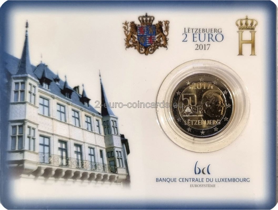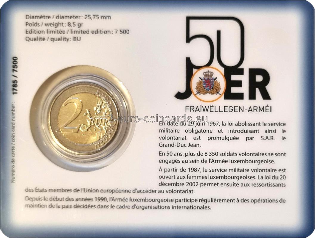 Na pravej strane motívu je znázornená podobizeň jeho kráľovskej výsosti veľkovojvodu Henricha hľadiaceho vpravo a na ľavej strane sa nachádza logo pozostávajúce z textu „50 Joer Fräiwëllegen-Arméi“. V hornej časti motívu sa nachádza rok vydania „2017“ lemovaný značkou Kráľovskej holandskej mincovne v Utrechte (Merkúrová palica) a značkou jej riaditeľa (Maarten Brouwer, plachetnica). V dolnej časti figuruje názov vydávajúcej krajiny „LËTZEBUERG“.