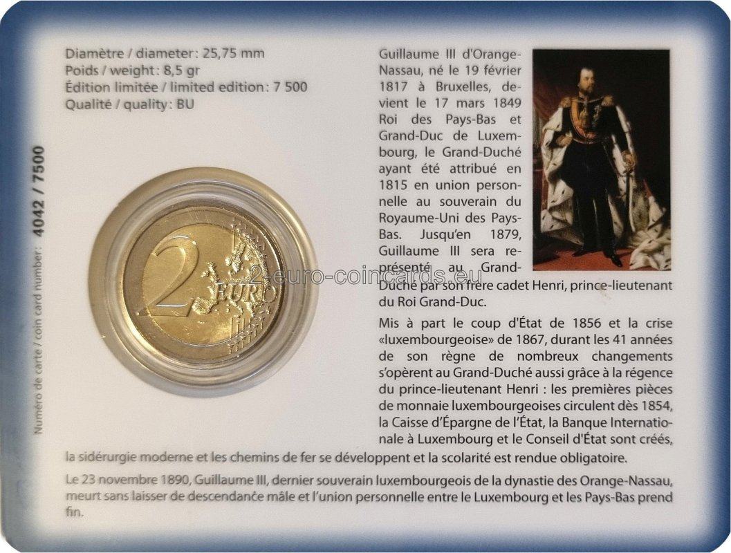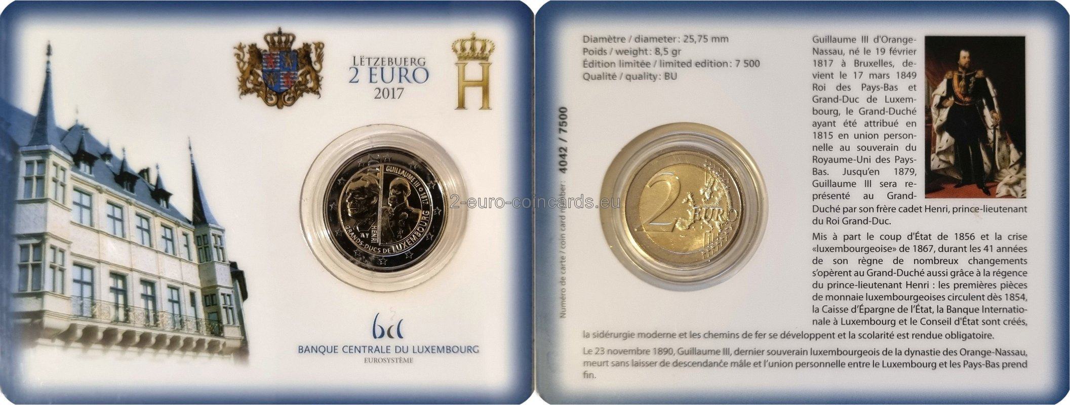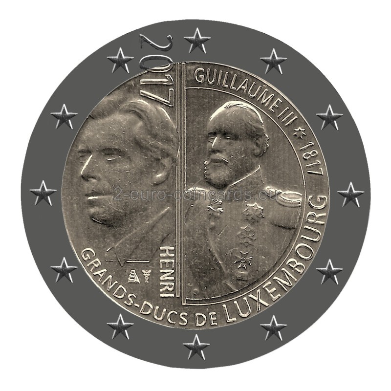 Na ľavej strane mince hore sa v hornej časti nachádza letopočet „2017“, pod ním je podobizeň jeho kráľovskej výsosti veľkovojvodu Henricha hľadiaceho doľava, dole je vertikálne vyryté meno panovníka "HENRI", značka riaditeľa Kráľovskej holandskej mincovne v Utrechte (Maarten Brouwer, plachetnica) a značka mincovne (Merkúrova palica). Na pravej strane je podobizeň jeho kráľovskej výsosti veľkovojvodu Guillaumea III. Vpravo pozdĺž okraja mince je uvedené meno panovníka vo francúzštine a rok jeho narodenia: "GUILLAUME III ★ 1817". Text v dolnej časti pozdĺž okraja mince: "GRANDS-DUCS DE LUXEMBOURG".