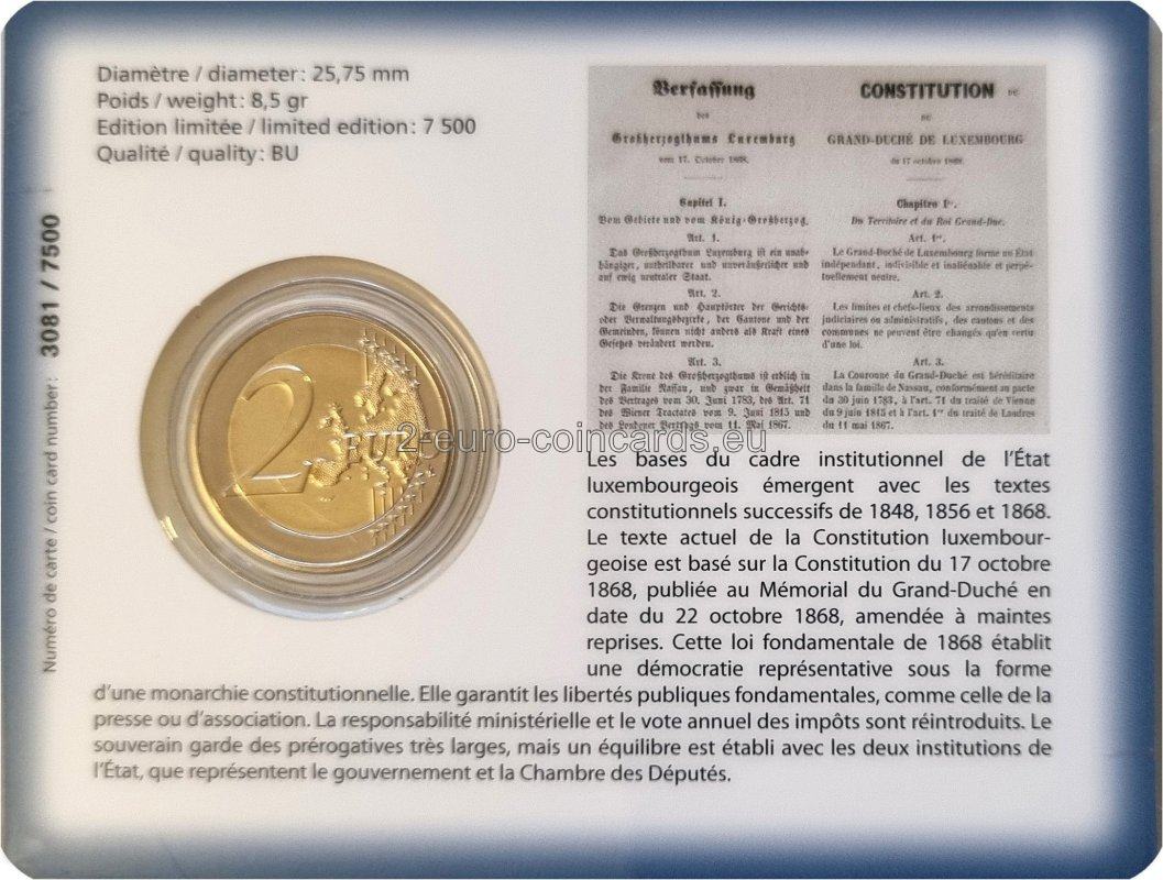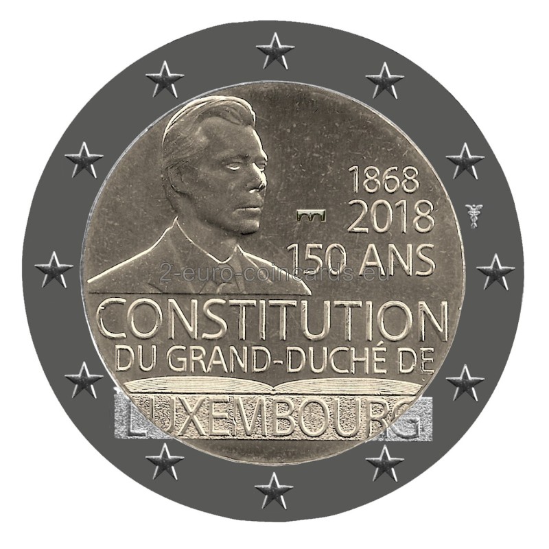 Na ľavej strane vzoru je znázornená podobizeň Jeho kráľovskej výsosti veľkovojvodu Henricha hľadiaceho vpravo. Na pravej strane vzoru sú uvedené letopočty „1868 – 2018“ a text „150 ans“ (150 rokov). Pod podobizňou veľkovojvodu sa nachádza text „Constitution du Grand-Duché de Luxembourg“ (Ústava Luxemburského veľkovojvodstva) a bočný pohľad na otvorenú knihu. Naľavo od letopočtu 2018 sa nachádza značka riaditeľa Kráľovskej holandskej mincovne v Utrechte (Stephan Satijn, most) a napravo značka mincovne (Merkúrová palica).
