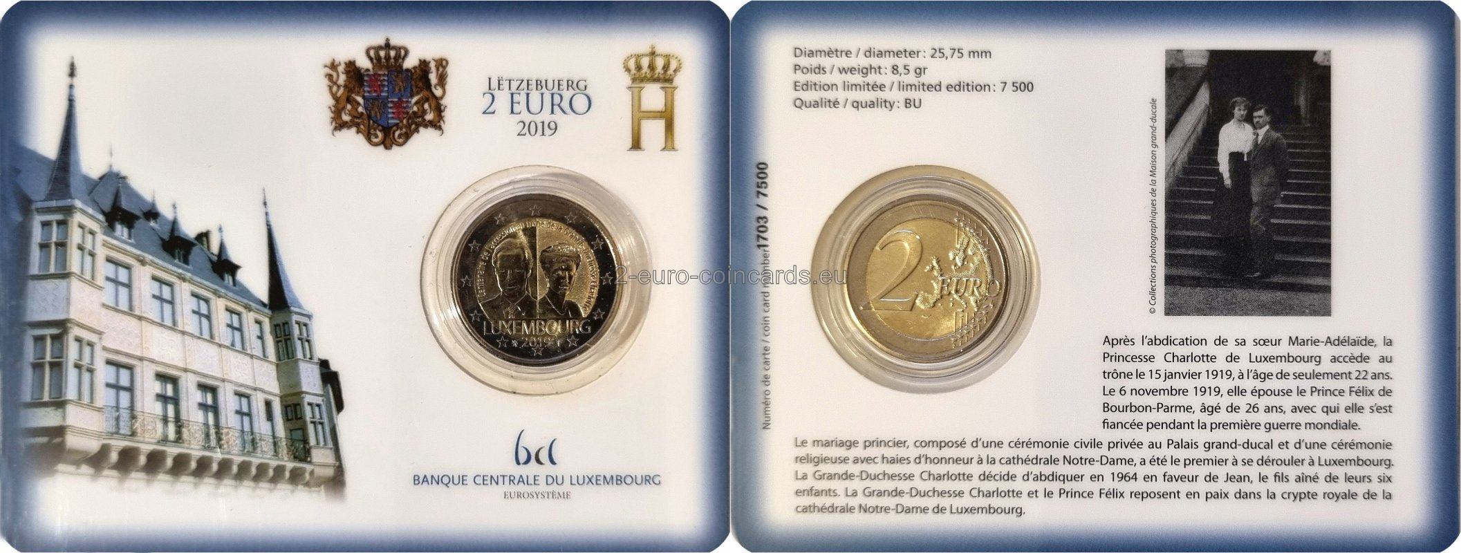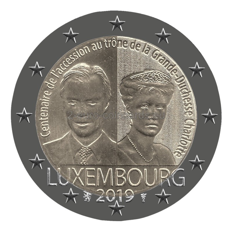 Na ľavej strane mince je vyobrazená podobizeň jeho kráľovskej výsosti veľkovojvodu Henricha a na pravej strane je podobizeň veľkovojvodkyne Šarloty. V spodnej časti mince je uvedený názov vydávajúcej krajiny „LUXEMBOURG“ a pod ním rok vydania „2019“. Vo vrchnej časti je v polkruhu okolo portrétov uvedený nápis „Centenaire de l’accession au trône de la Grande-Duchesse Charlotte“ (storočnica nástupu veľkovojvodkyne Šarloty na trón). Naľavo od letopočtu 2019 sa nachádza značka Lev (heraldický lev Luxemburska) a napravo značka mincovne (Merkúrová palica).