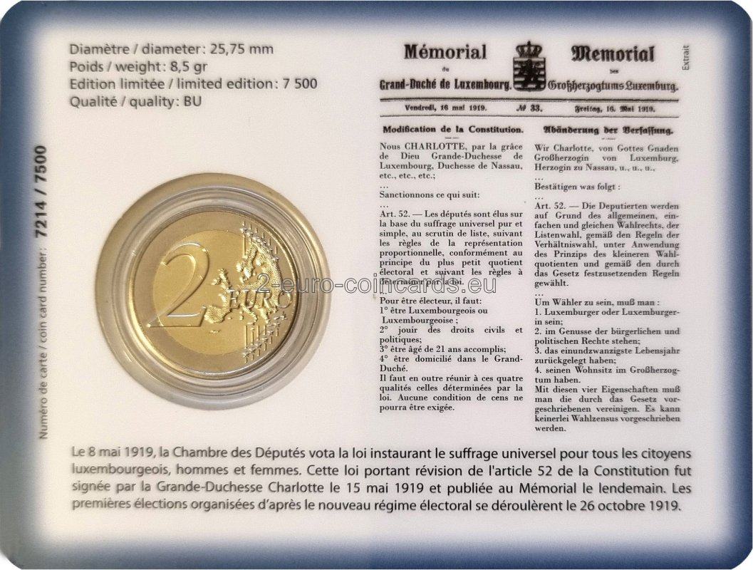 Na ľavej strane mince je vyobrazená podobizeň jeho kráľovskej výsosti veľkovojvodu Henricha a na pravej strane je zobrazená ruka, ktorá do volebnej urny vhadzuje volebný lístok. V dolnej časti mince je uvedený názov vydávajúcej krajiny „LUXEMBOURG“. V hornej časti je v polkruhu uvedený nápis „Centenaire du suffrage universel“ (sté výročie všeobecného volebného práva), pod ktorým sa nachádzajú letopočty „1919 – 2019“, pričom rok 2019 označuje rok vydania. Naľavo od letopočtu 2019 sa nachádza značka riaditeľa Kráľovskej holandskej mincovne v Utrechte (Stephan Satijn, most) a napravo značka mincovne (Merkúrová palica).