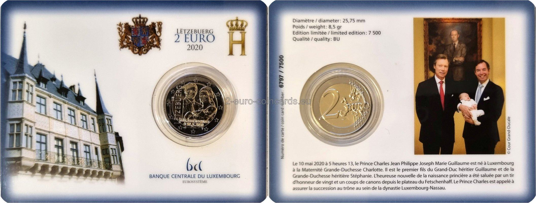 V strede vzoru je vyobrazený princ Karol a podobizne jeho rodičov – Ich kráľovských Výsostí dedičného veľkovojvodu Viliama a dedičnej veľkovojvodkyne Štefánie. Na ľavej strane je zvisle vpísaný názov vydávajúcej krajiny „LËTZEBUERG“. Monogram (písmeno „H“ s korunou) je symbolom veľkovojvodu Henricha. Pod podobizňami je text „S.A.R. de Prënz Charles“ (Jeho kráľovská Výsosť princ Karol) a dátum princovho narodenia „☆ 10.5.2020“. Pod dátumom sa vľavo nachádza značka riaditeľa Kráľovskej holandskej mincovne v Utrechte (Stephan Satijn, most) a napravo značka mincovne (Merkúrová palica).