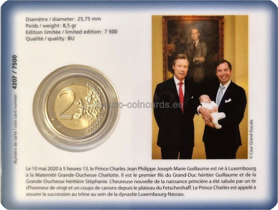 V strede vzoru je vyobrazený princ Karol a podobizne jeho rodičov – Ich kráľovských Výsostí dedičného veľkovojvodu Viliama a dedičnej veľkovojvodkyne Štefánie. Na ľavej strane je zvisle vpísaný názov vydávajúcej krajiny „LËTZEBUERG“. Monogram (písmeno „H“ s korunou) je symbolom veľkovojvodu Henricha. Pod podobizňami je text „S.A.R. de Prënz Charles“ (Jeho kráľovská Výsosť princ Karol) a dátum princovho narodenia „☆ 10.5.2020“. Pod dátumom sa vľavo nachádza značka riaditeľa Kráľovskej holandskej mincovne v Utrechte (Stephan Satijn, most) a napravo značka mincovne (Merkúrová palica).
