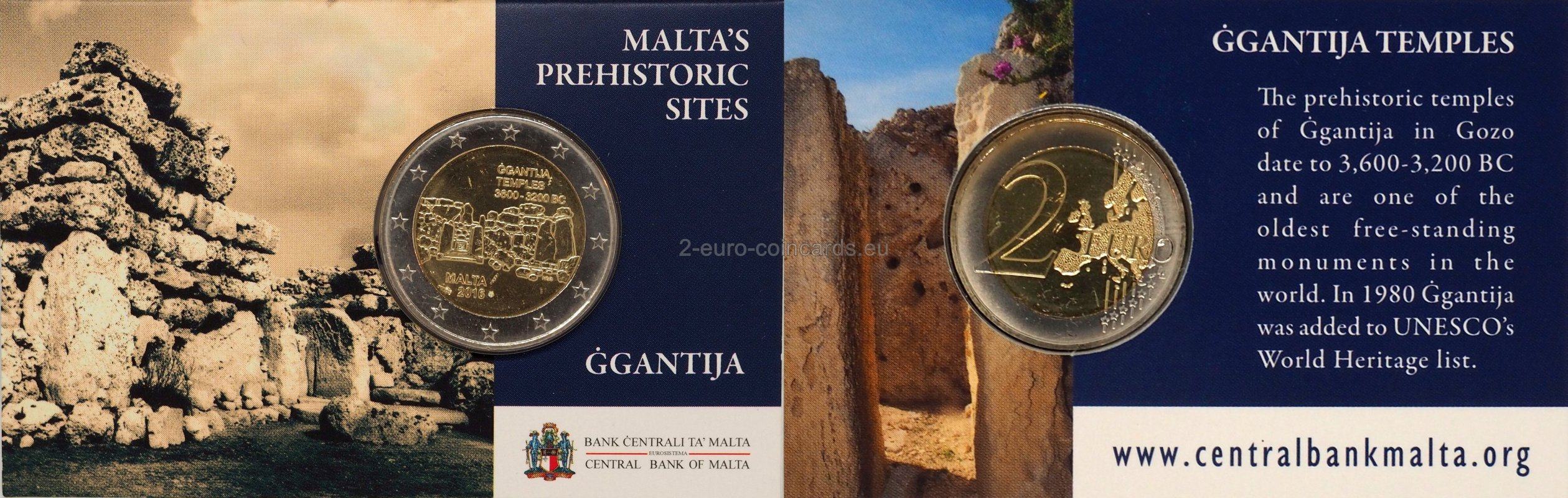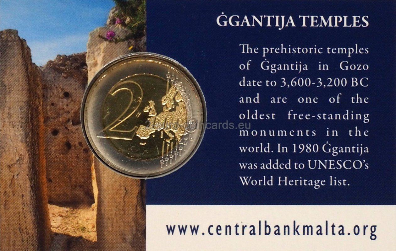 Na minci je vyobrazené chrám Ġgantija nachádzajúci sa na ostrove Gozo. Názvom Ġgantija (Veža obrov) je pomenovaný megalitický chrámový komplex pochádzajúci z neolitu. Ide o jednu z najstarších samostatne stojacich stavieb a zároveň o jednu z najstarších náboženských stavieb. Chrámy Ġgantija boli postavené približne v 36. storočí p. n. l, čo znamená, že sú staršie ako Stonehenge a egyptské pyramídy. Chrámový komplex Ġgantija sa nachádza na náhornej plošine Šaara. Ako všetky maltské chrámy postavené z megalitov má juhovýchodnú orientáciu. Má tvar trojlístka. Sály sú postavené tesne vedľa seba a ohradené ďalšou stenou zo zvislých megalitických blokov. Jednotlivé kamene múru sa týčia do výšky 5,5 metra a vážia približne 50 ton. Najväčší južný chrám je zároveň najstarší. Ten pochádza z obdobia približne 3600 rokov pred n. l. Lepšie zachovaná časť stavby na rozdiel od severného chrámu umožňuje archeológom rekonštruovať pôvodné formy megalitickej stavby. Vnútorná dispozícia chrámu zahŕňa 5 veľkých apsid. Pri stavbe chrámu použili starovekí architekti kyklopský štýl muriva. Inými slovami, stavba sa realizovala bez malty a jednotlivé kamenné bloky sa pre svoju veľkú hmotnosť v konštrukcii udržiavali a nerovnosti stien stavitelia odstraňovali pomocou omietky. Výstavba komplexu prebiehala v čase, keď ešte nebolo vynájdené koleso, a bez použitia kovových nástrojov. Archeológovia našli neďaleko komplexu kamenné gule. Predpokladá sa, že pomohli starovekým staviteľom premiestniť veľké bloky na miesto, kde boli postavené chrámy. Južný chrám sa týči 6 metrov nad zemou. Neďaleko vchodu sa našiel veľký blok, v ktorom bola špeciálne vytvorená dutina. Mohol sa používať ako nádrž na očistenie pred vstupom do chrámu. V každej z piatich apsid boli oltáre na obetovanie zvierat a ich kosti sa našli v blízkosti obetných miest. Pri archeologickom výskume sa objavilo aj množstvo sôch zasvätených bohom plodnosti, čo umožnilo vedcom navrhnúť, že chrámy na ostrove Gozo patrili tomuto kultu. O existencii chrámového komplexu dlho vedeli len miestni obyvatelia a dobrodruhovia. V roku 1827 však plukovník John Otto Bayer, ktorý pôsobil ako zástupca guvernéra ostrova Gozo, vydal príkaz na vyčistenie ruín. Je pravda, že potom pozostatky starobylej stavby chátrali. Okrem toho boli staroveké chrámy očistené od trosiek spolu s vrchnou vrstvou pôdy, ktorá mohla obsahovať neoceniteľný výskumný materiál pre archeológov. Preto sa mnohé veci museli obnoviť len vďaka úsiliu umelcov, ktorým sa podarilo zachytiť chrámový komplex pred jeho "vyčistením". Napríklad koncom 18. storočia navštívil Gozo francúzsky maliar Jean-Pierre Owel. A len niekoľko rokov pred začiatkom "očistných" prác megalitickú pamiatku do najmenších detailov zobrazil maliar Frederick Charles de Brochtorff. V roku 1925 bola Ġgantija zapísaná na zoznam pamiatok, čo však až do roku 1933 nebránilo tomu, aby bol chrámový komplex v súkromnom vlastníctve. Hĺbkový výskum chrámov na ostrove Gozo sa začal po tom, ako Ministerstvo múzeí iniciovalo vykopávky, ktoré sa uskutočnili v 30. a 50. rokoch 20. storočia. Hlavnou úlohou vedcov bolo vyčistiť megalitickú stavbu a jej okolie a pamiatku zachovať a preskúmať. V roku 1980 bola Ġgantija zapísaná do Zoznamu svetového dedičstva UNESCO. O dvanásť rokov neskôr bolo na zoznam pridaných ďalších päť megalitických stavieb z Malty, po ktorých chránená lokalita dostala názov "Megalitické chrámy Malty". Chrámový komplex a jeho okolie boli obnovené v roku 2000. V roku 2011 tu boli nainštalované svetelné chodníky a v roku 2013 je lokalita otvorená pre prehliadky so sprievodcom.