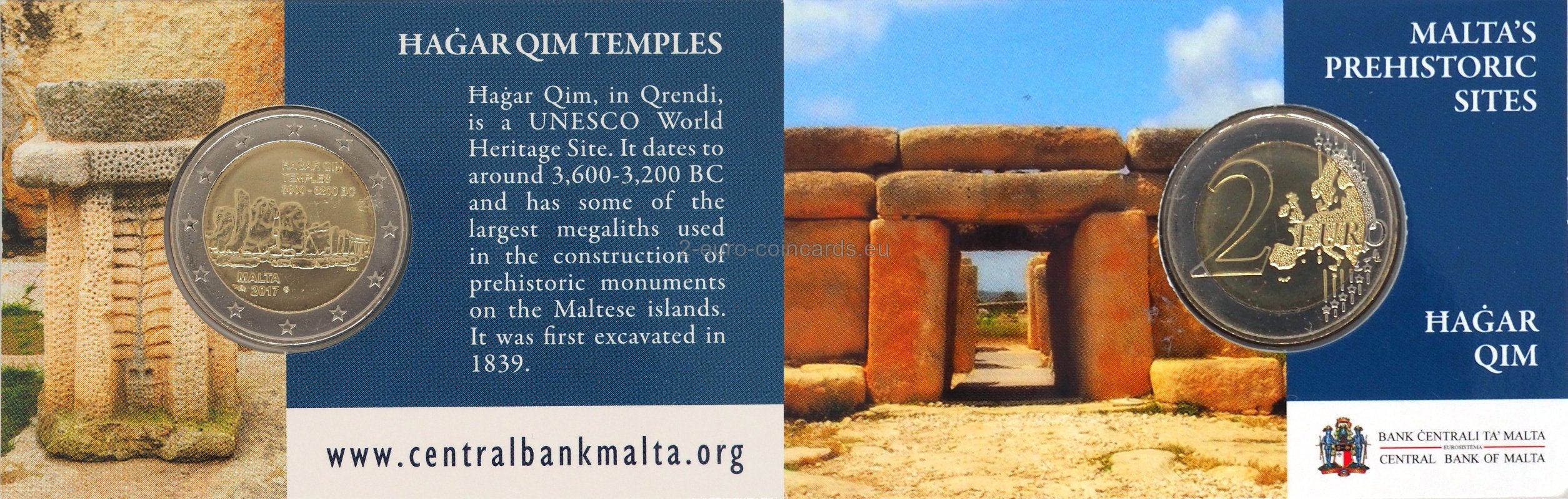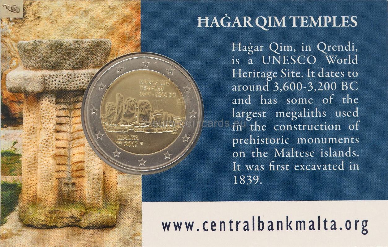 Na minci sú vyobrazené prehistorické chrámy Ħaġar Qim. V pravej hornej časti sú pod sebou uvedené nápisy „ĦAGAR QIM“ a „TEMPLES“ a pod nimi roky „3600-3200 BC“. Vľavo dole sa nachádza názov vydávajúcej krajiny „MALTA“ a pod ním rok vydania „2017“. Vpravo dole sú iniciály umelca „NGB“ (Noel Galea Bason). Okolo letopočtu 2017 sa nachádzajú značky Parížskej mincovne Pesssac, (roh hojnosti), a jej vedúceho rytca Yves Sampo, (päťuholník).