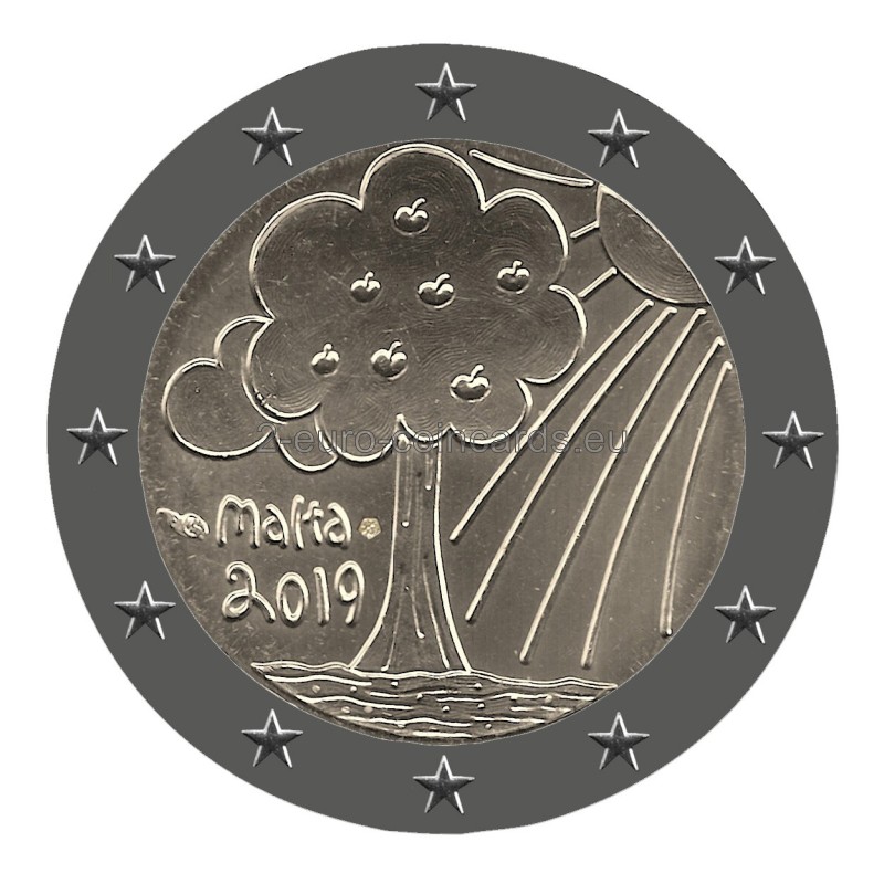 Na vzore, ktorého autorom je študent strednej školy, je znázornený ovocný strom a štylizované zobrazenie slnka. Vľavo dole je uvedený názov vydávajúcej krajiny „MALTA“ a pod ním rok vydania „2019“. Okolo textu 2019 sa nachádzajú značky Parížskej mincovne Pessac (roh hojnosti, vľavo) a jej hlavného rytca (Yves Sampo, päťuholník, vpravo). Mincu bola vydaná v blistri v tvare záložky do knihy.
