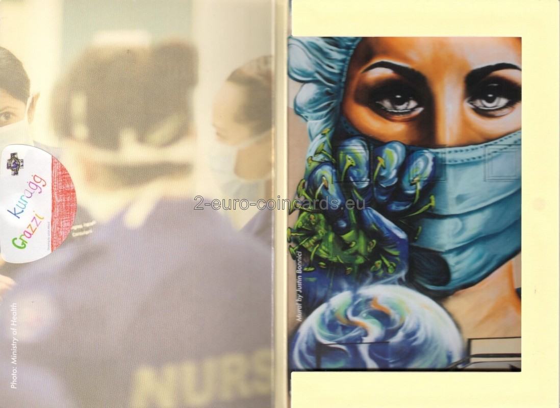 V celosvetovom úsilí o potlačenie pandémie COVID-19 sa svet zastavil. Pre tých čo stáli v prvej línii však nebolo možné zostať stáť na mieste, pretože denne odvážne čelili vírusu. Pandémia znamenala, že bolo potrebné prijať ťažké rozhodnutia a rýchlo konať. Zdravotnícke orgány sa museli rozhodovať na základe informácií, ktoré mali v tom čase k dispozícii, zvažovať dôsledky rôznych krokov a čo najlepšie sa orientovať medzi zdravím ľudí a ich živobytím. Táto minca je venovaná všetkým, ktorí sa počas tejto pandémie podieľali na fungovaní maltského zdravotníctva, najmä zdravotníckym pracovníkom v prvej línii. Je to národný prejav uznania za ich záslužnú prácu v ťažkých časoch a za náročných okolností.
