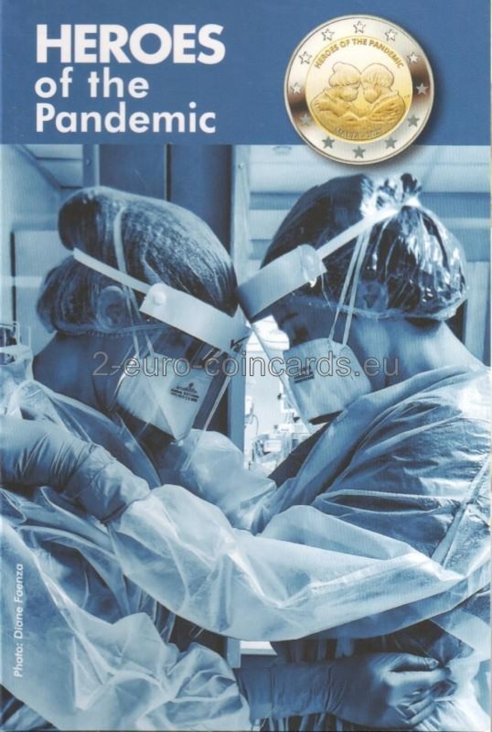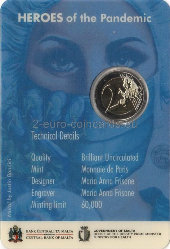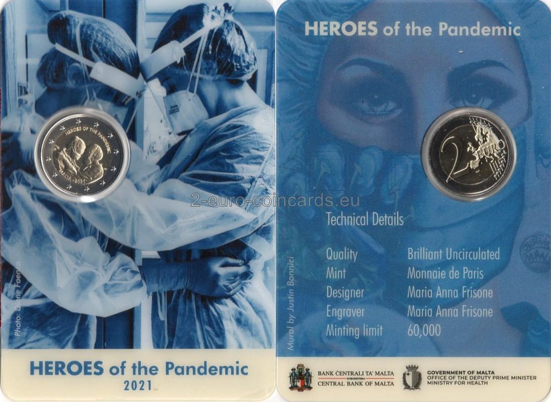 Predlohou návrhu mince bola fotografia dvoch maltských zdravotných sestier, Doreen Zammitovej a Charmaine Cauchiovej, zhotovená v nemocnici Mater Dei v apríli 2020 počas prvej vlny COVID-19. Fotografiu urobila zdravotná sestra Diane Faenza a uverejnila ju vo facebookovej galérii Times of Malta, po ktorej získala popularitu a stala sa symbolom boja proti pandémii. Jeho cieľom je vzdať úctu týmto obetavým jednotlivcom, ktorí stáli na čele boja proti pandémii COVID-19. Na vnútornom disku sú zobrazené dve sestry v ochranných oblekoch, ktoré sa objímajú. V hornej časti je v polkruhu uvedený nápis „HEROES OF THE PANDEMIC“ (HRDINOVIA PANDÉMIE). V dolnej časti je v polkruhu uvedený nápis „MALTA – 2021“. Vľavo od obrazu sa nachádzajú značka Parížskej mincovne Pessac (roh hojnosti, hore) a pod ňou značka jej hlavného rytca (Joaquin Jimenez, štvorec s malým štvorcom v ľavom hornom rohu).