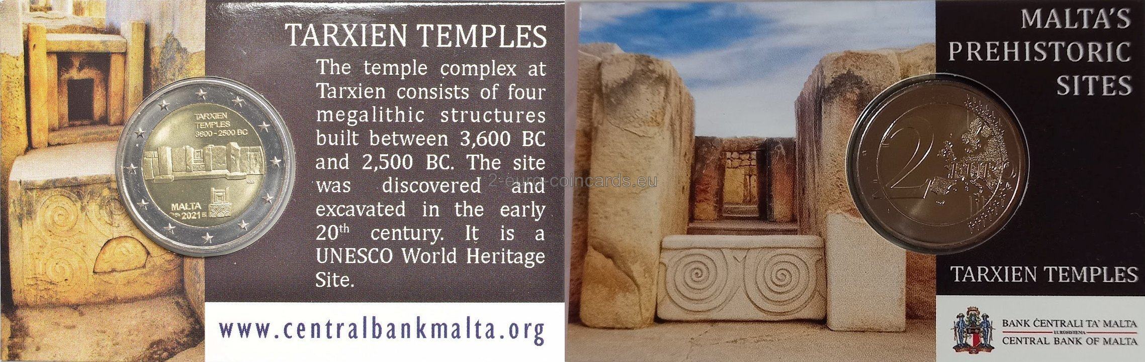 Na minci je vyobrazený detail prehistorickej stavby. V hornej časti je nápis „TARXIEN TEMPLES 3600 – 2500 BC“. V dolnej časti sa nachádza názov vydávajúcej krajiny „MALTA“ a pod ním rok vydania „2021“. Okolo roku vydania sa nachádzajú značky Parížskej mincovne Pesssac, roh hojnosti, jej hlavného rytca, Joaquin Jimenez, štvorec s malým štvorcom v ľavom hornom rohu. Vpravo je zobrazený antický oltár. Vpravo sú tiež iniciály autora "NGB" (Noel Galeu Bason).