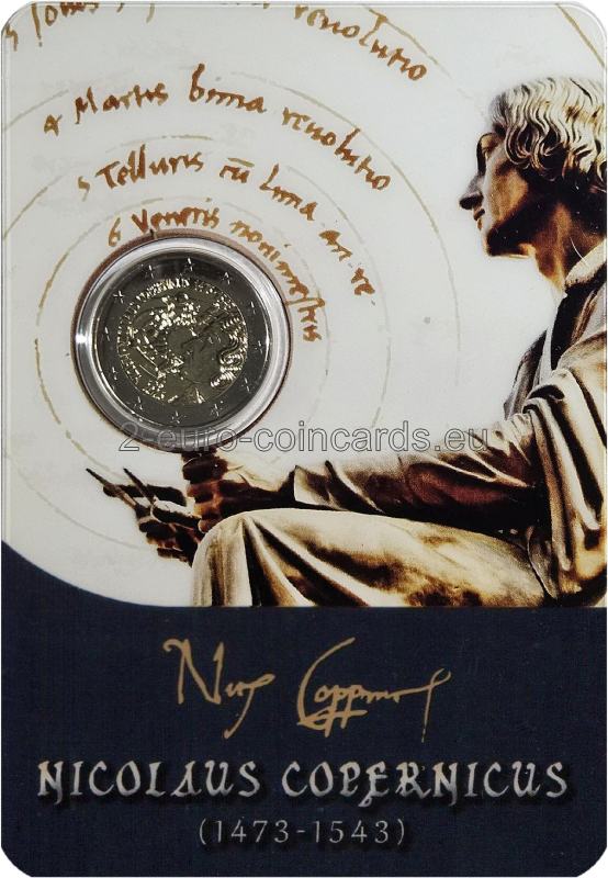 Na minci je vyobrazený portrét Kopernika z profilu a štylizované heliocentrické zobrazenie vesmíru podľa jeho návrhu. Vľavo hore sa nachádza nápis „NICOLAUS COPERNICUS 1473 – 1543“, vľavo dole je názov vydávajúcej krajiny „MALTA“ a rok vydania „2023“. Takisto v dolnej časti sa nachádza podpis umelkyne Daniely Fuscoovej „FUSCO“.
