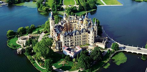 Na severe Nemecka sa uprostred jazera Schwerin rozprestiera rovnomenný zámok. Postavili ho na malom ostrovčeku, no napriek tomu vás prekvapí svojou veľkoleposťou. Nachádza sa v ňom niekoľko stoviek miestností a vďaka tomu patrí medzi najrozsiahlejšie šľachtické sídla v krajine. Prvú pevnosť postavili na tomto mieste už v 10. storočí. Vtedy túto oblasť obývali pobaltskí Slovania, ktorí sa zaslúžili o jej výrazný rozvoj. No zámok, ako ho poznáme teraz, vybudovali v období medzi rokmi 1848 a 1857. Autorom nápadu bol Fridrich František II., ktorý bol vojvodom v Mecklenburgu-Schwerine. Pôvodne chcel iba rekonštruovať už zastarané šľachtické sídlo, nakoniec sa však pustil do väčšej prestavby a vytvoril veľkolepý komplex, ktorý tvorí až 653 miestností. Väčšina z nich bola luxusne zariadená a bohato zdobená. Vojvoda bol pri prestavbe veľmi náročný. Neustále menil plány a od svojho hlavného architekta Georga Adolfa Demmlera žiadal, aby našiel čo najdokonalejší štýl prevedenia. Preto ho poslal na cestu po Európe a chcel od neho, aby pozoroval tie najkrajšie zámky v ostatných krajinách. Nakoniec vďaka tomu vznikol mix medzi pruským neoklacisizmom a tudorovskou gotikou, ktorý konečne oslovil aj Fridricha Františka II. Tento štýl sa odrazil aj pri zariaďovaní interiéru. Najkrajšou komnatou je trónna miestnosť, v ktorej sa nachádza trón a je bohato zdobená. V minulosti ju využívali na organizovanie večierkov.V tomto období predstavovala stavba pýchu celého regiónu a pravidelne tam jazdili na výlety a krátke pobyty predstavitelia európskej šľachty. Vojvodovi potomkovia tam žili až do roku 1918, potom zámok prešiel pod správu štátu a od roku 1948 tam sídli krajský parlament.