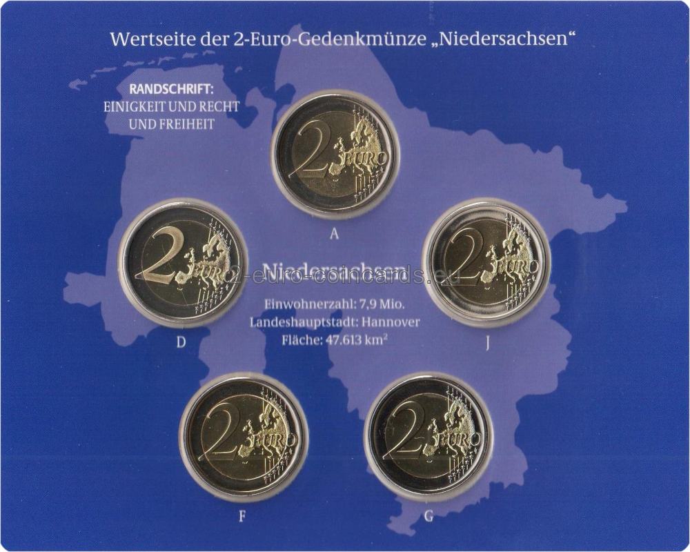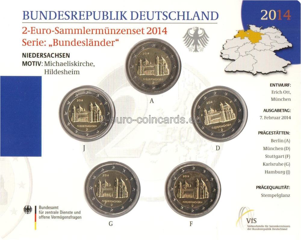 Na vzore je vyobrazený kostol svätého Michala v Hildesheime v Dolnom Sasku. V hornej časti je rok vydania „2014“ a v ľavej časti značka príslušnej mincovne, vyjadrená písmenami A, D, F, G alebo J. V dolnej časti sa nachádza nápis „NIEDERSACHSEN“ a pod ním označenie vydávajúcej krajiny D. Vpravo hore sa nachádzajú iniciály rytca Otta Ericha „Œ".