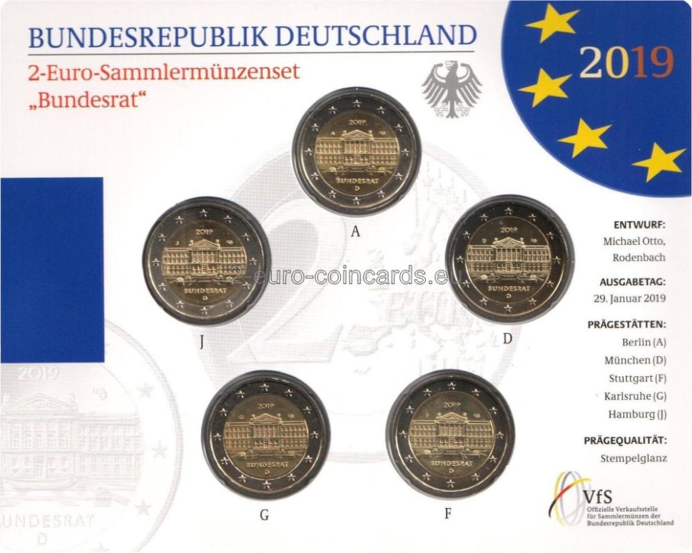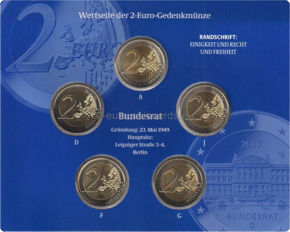 Vzor veľmi detailne a filigránsky zobrazuje budovu Spolkovej rady. Vo vnútornej časti mince sa hore nachádza značka mincovne, vyjadrená písmenami A, D, F, G alebo J, iniciály umelca a rok „2019“. V spodnej časti vnútorného kruhu mince je uvedený nápis „BUNDESRAT“ a kód vydávajúcej krajiny Nemecko „D“.