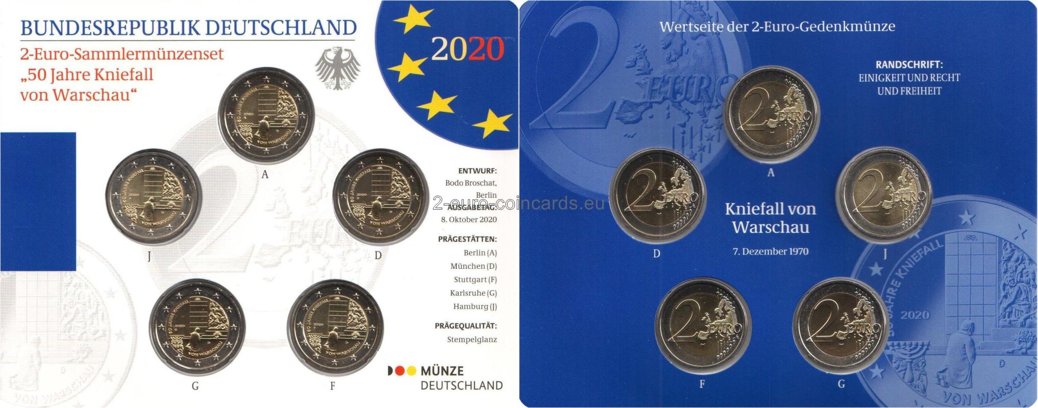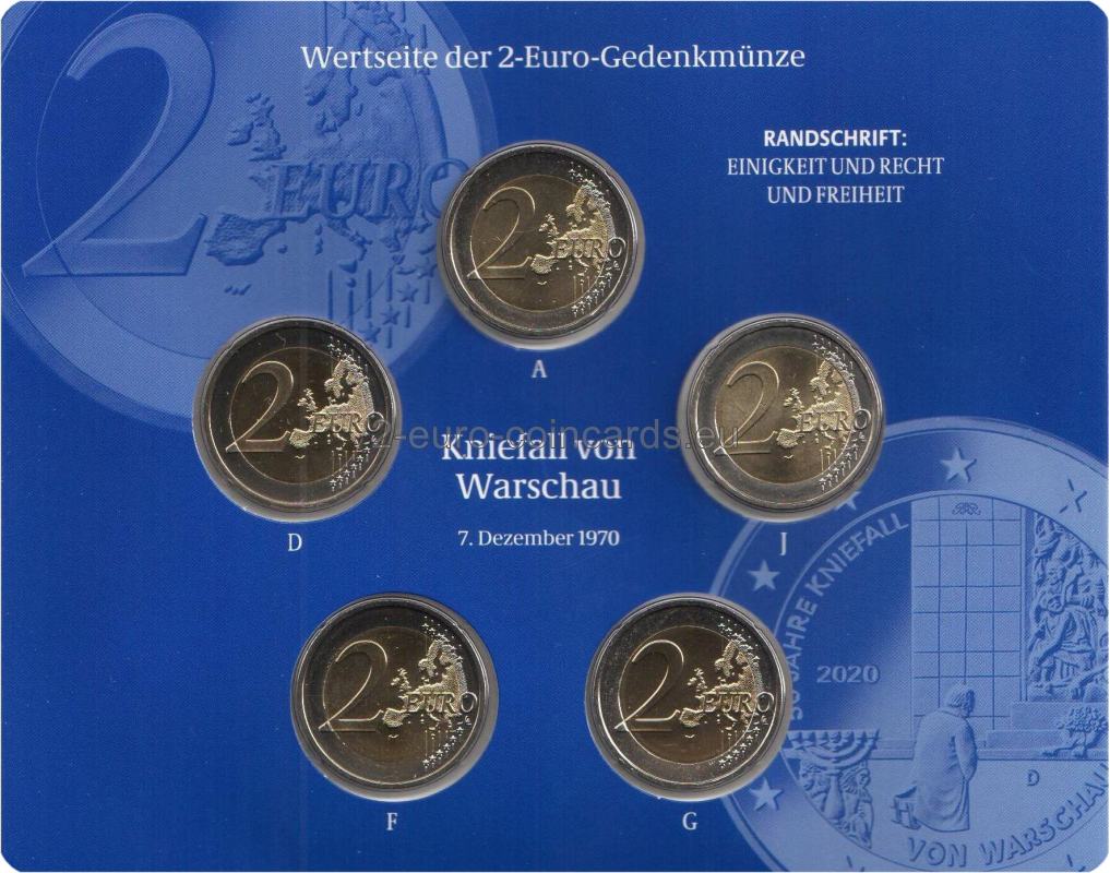 Na vzore je vyobrazený bývalý nemecký kancelár Willy Brantd, ako na znak pokory kľačí pred pomníkom hrdinov geta vo Varšave. Jeho silne obrazná kompozícia odkazuje na povstanie vo varšavskom gete v roku 1943. Na veľmi jemnom reliéfe vzoru sú vyobrazené výrečné symboly: sedemramenný svietnik, obete z geta, ako aj pokľaknutie. Vo vnútornej časti mince sú uvedené aj iniciály umelca (hore), značka mincovne, vyjadrená písmenami A, D, F, G alebo J, rok „2020“ (v strede vľavo), kód vydávajúcej krajiny Nemecko – „D“ (vpravo dole) a nápis „50 JAHRE KNIEFALL VON WARSCHAU“.