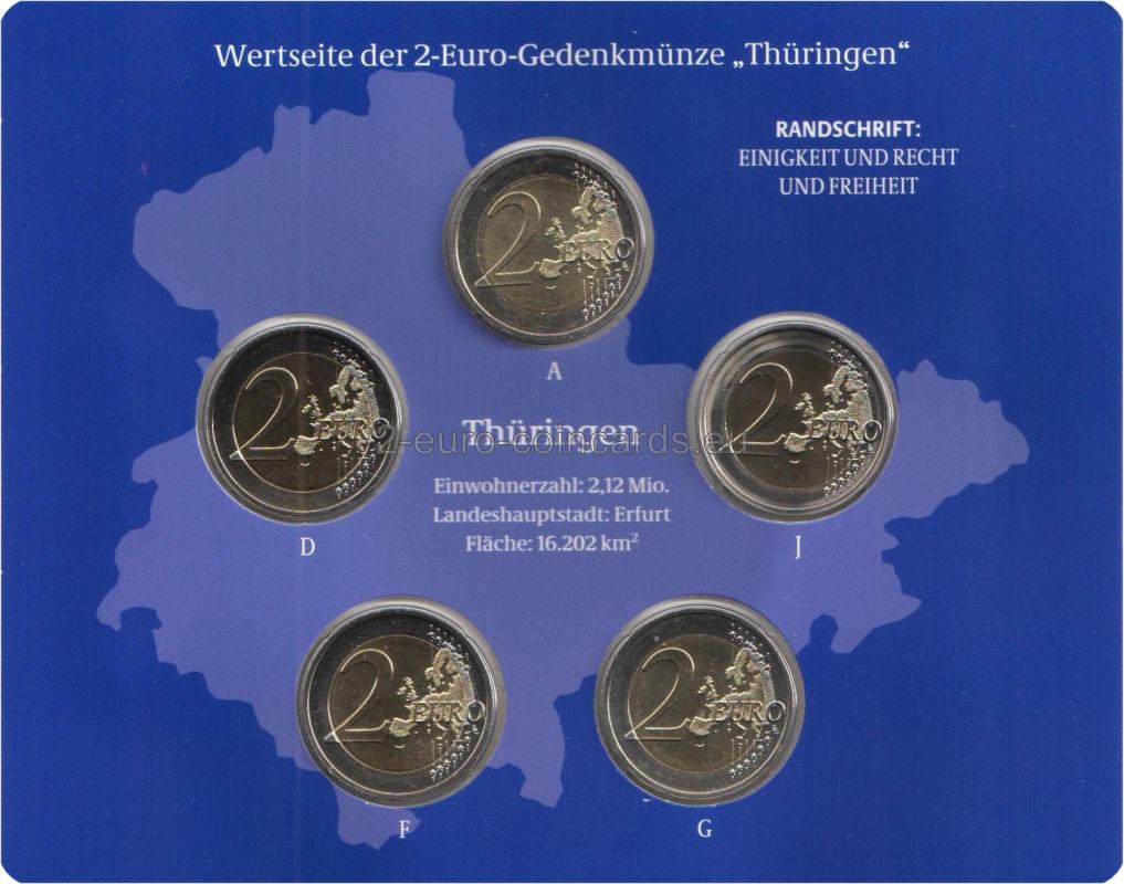 Na vzore je vyobrazený hrad Wartburg, prvý nemecký hrad zaradený do zoznamu svetového dedičstva UNESCO. Vo vnútornej časti mince sa nachádza názov „THÜRINGEN“ a pod ním kód vydávajúcej krajiny „D“. Na pravej strane je uvedená značka Značka mincovne, vyjadrená písmenami A, D, F, G alebo J, a značka rytca a na ľavej strane sa nachádza rok „2022“. Umelec: Olaf Stoy (Rabenau).