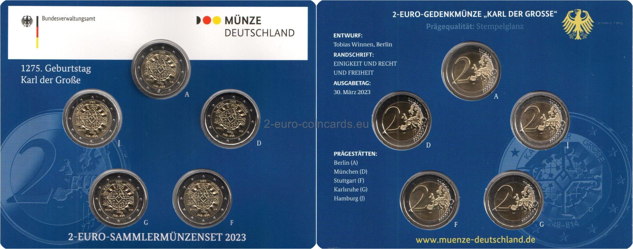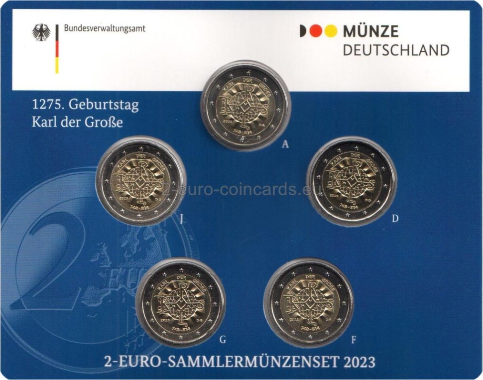 Vzor kombinuje dva súčasné prvky: osobný monogram Karola Veľkého a oktogón katedrály v Aachene. Obidva motívy sú obratne spojené do jedného umeleckého celku. Sila motívu spočíva v jeho dynamickej a trojdimenzionálnej povahe. Celkovo ide o inovatívne vzdanie pocty významnej osobnosti európskych dejín. Na vnútornom prstenci mince sa v hornej časti nachádza nápis „KARL DER GROßE“ (Karol Veľký) a v dolnej polovici je uvedený rok vydania „2023“, dátumy „748 – 814“, kód Nemecka ako vydávajúcej krajiny „D“, značka príslušnej mincovne, vyjadrená písmenami A, D, F, G alebo J, iniciály umelca Tobiasa Winnena „TW“.