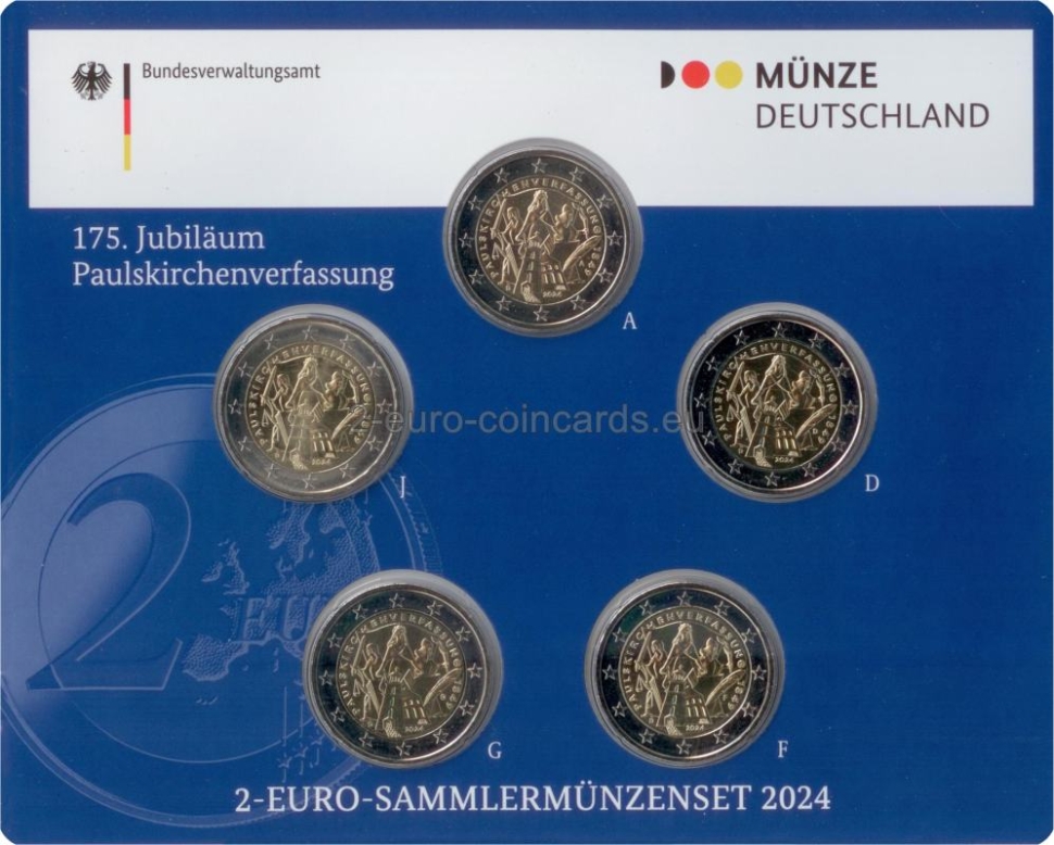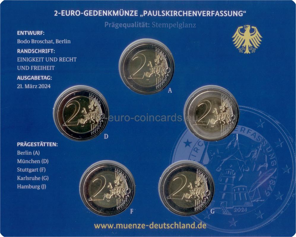 Návrh obsahuje niekoľko tematických vrstiev. V popredí je perspektívne zobrazený kostol sv. Pavla, do ktorého vchádzajú členovia národného ústavodarného zhromaždenia. Tento výjav prekrýva ústavnú listinu a brko, ktoré predstavujú výsledok rokovania Frankfurtského parlamentu. Návrh napokon korunujú tri ženské postavy, ktoré predstavujú alegóriu Jednoty, Spravodlivosti a Slobody, a trojfarebná čierno-červeno-zlatá vlajka. Dynamický trojrozmerný reliéf evokuje nadčasovosť základných demokratických princípov, ktoré boli po prvýkrát písomne zakotvené vo Frankfurtskej ústave. Na vnútornom prstenci mince sa nachádza aj nápis „PAULSKIRCHENVERFASSUNG 1849“ („Ústava kostola sv. Pavla 1849“) a v dolnej časti rok vydania „2024“, kód Nemecka ako vydávajúcej krajiny – „D“, značka príslušnej mincovne („A“, „D“, „F“, „G“ alebo „J“) a iniciály berlínskeho autora návrhu mince Boda Broschata.