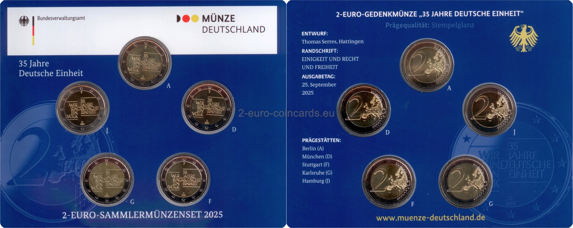 Na lícnej strane je nápis „WIR SIND EIN VOLK“. Táto veta znamená „Sme jeden národ“. Odkazuje na pokojné protesty pred pádom berlínskeho múru. Okrem toho je na ňom napísané „35 JAHRE DEUTSCHE EINHEIT“, čo v preklade znamená „35 rokov nemeckej jednoty“. V spodnej časti je uvedený letopočet "2025" a písmeno "D" označujúce vydávajúcu krajinu. V hornej časti iniciály TS označujú autora návrhu Thomasa Serresa.