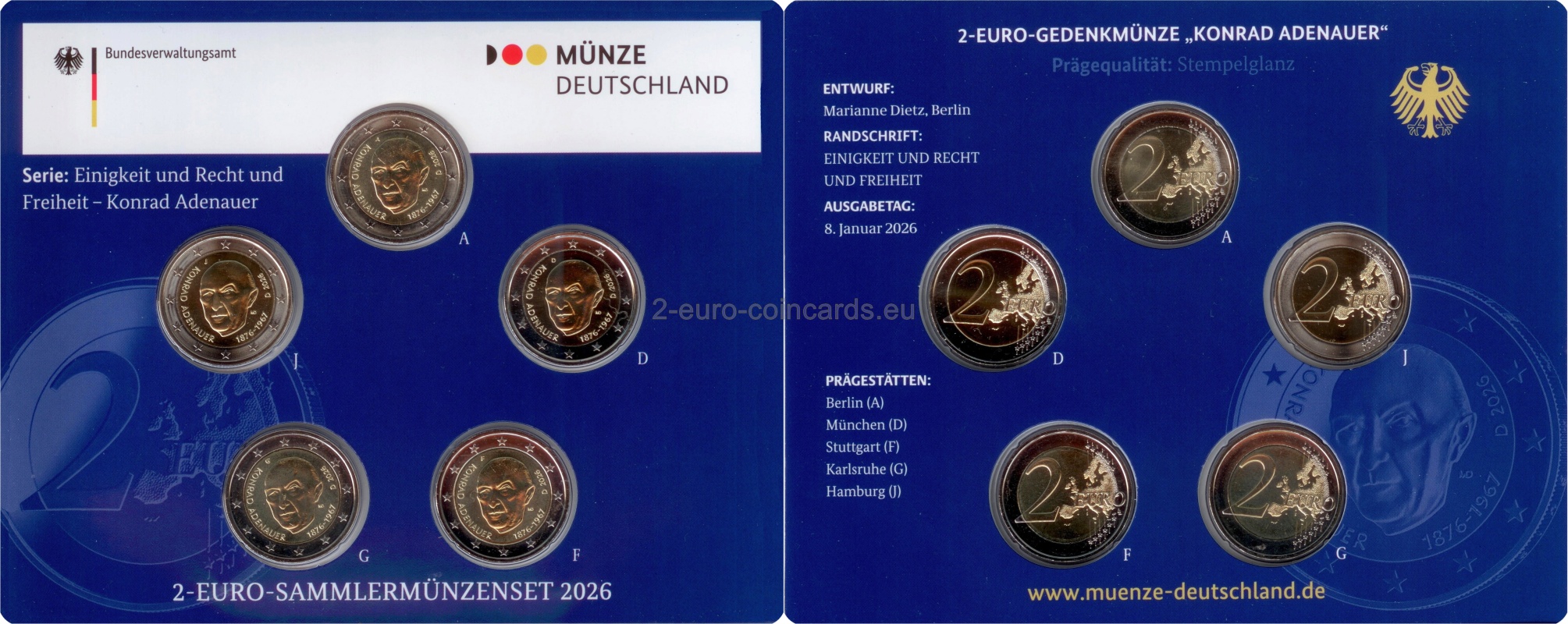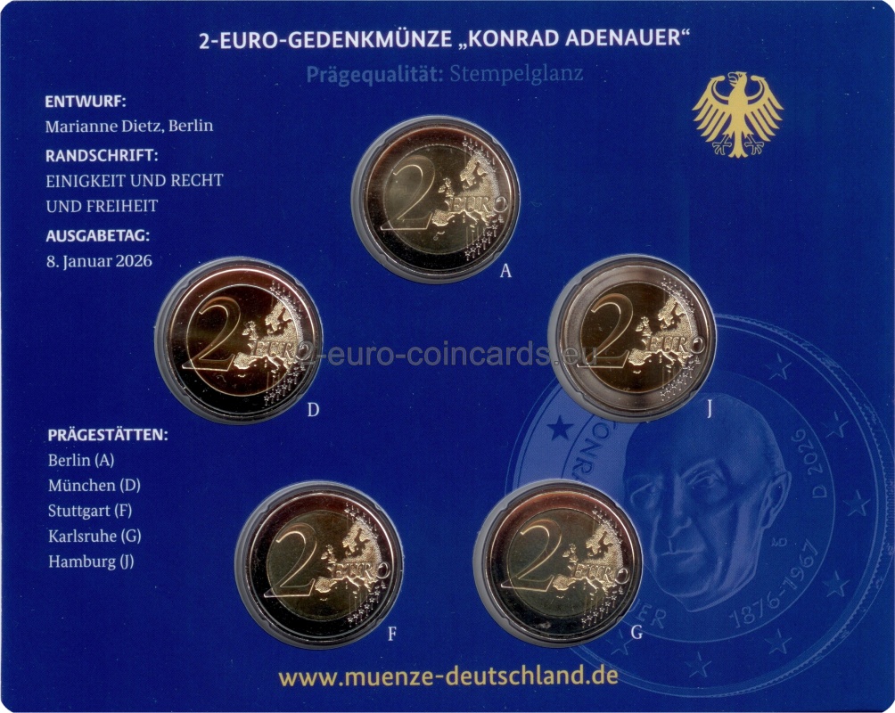 Na minci je zobrazený portrét Konrada Adenauera. V ľavej časti je značka mincovne a meno politika. V pravej časti je letopočet narodenia a úmrtia, skratka vydávajúcej krajiny "D" a rok vydania mince "2026".
