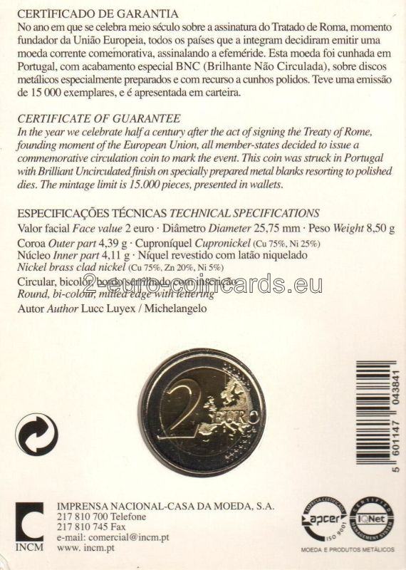 Preklad textu na obale: V roku, keď si pripomíname polstoročie od podpísania Rímskej zmluvy, ktorá bola zakladajúcim momentom Európskej únie, sa všetky členské štáty rozhodli vydať pamätnú obehovú mincu na pripomenutie tejto udalosti. Táto minca bola vyrazená v Portugalsku s povrchovou úpravou Brilliant Uncirculated na špeciálne pripravených kovových polotovaroch s využitím leštených razníc. Bola vydaná v náklade 15 000 kusov v kartičke peňaženkového formátu.