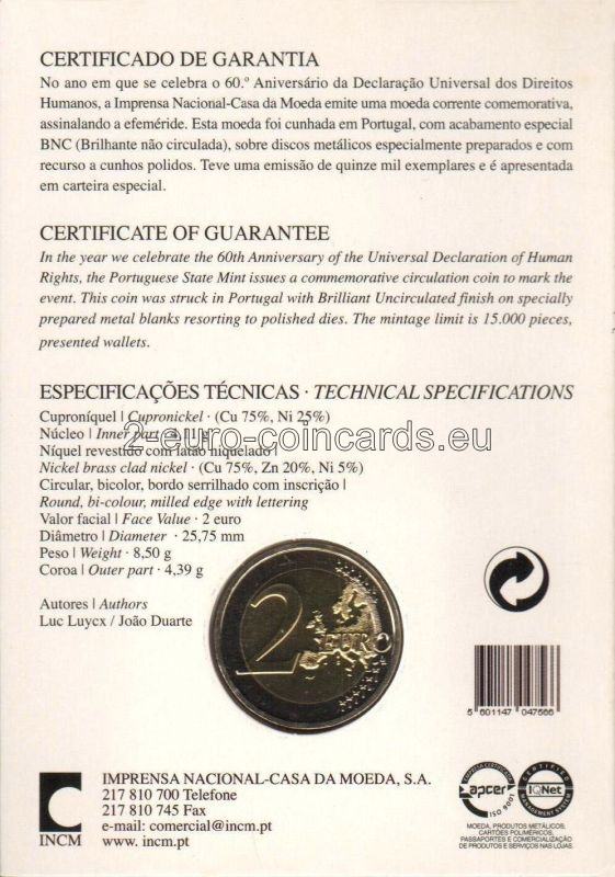 Na vnútornej strane mince je v hornej časti znázornený portugalský štátny znak nachádzajúci sa nad názvom vydávajúceho štátu „PORTUGAL“ a rokom „2008“ a dolnú časť stredu mince vypĺňa geometrický vzor. V dolných dvoch tretinách okraja vnútorného kruhu sa nachádza text: „60 ANOS DA DECLARAÇÃO UNIVERSAL DOS DIREITOS HUMANOS“, po ktorom nasleduje podpis autora napísaný drobným písmom „Esc. J. Duarte" a skratka Portugalskej mincovne - Imprensa Nacional (INCM).