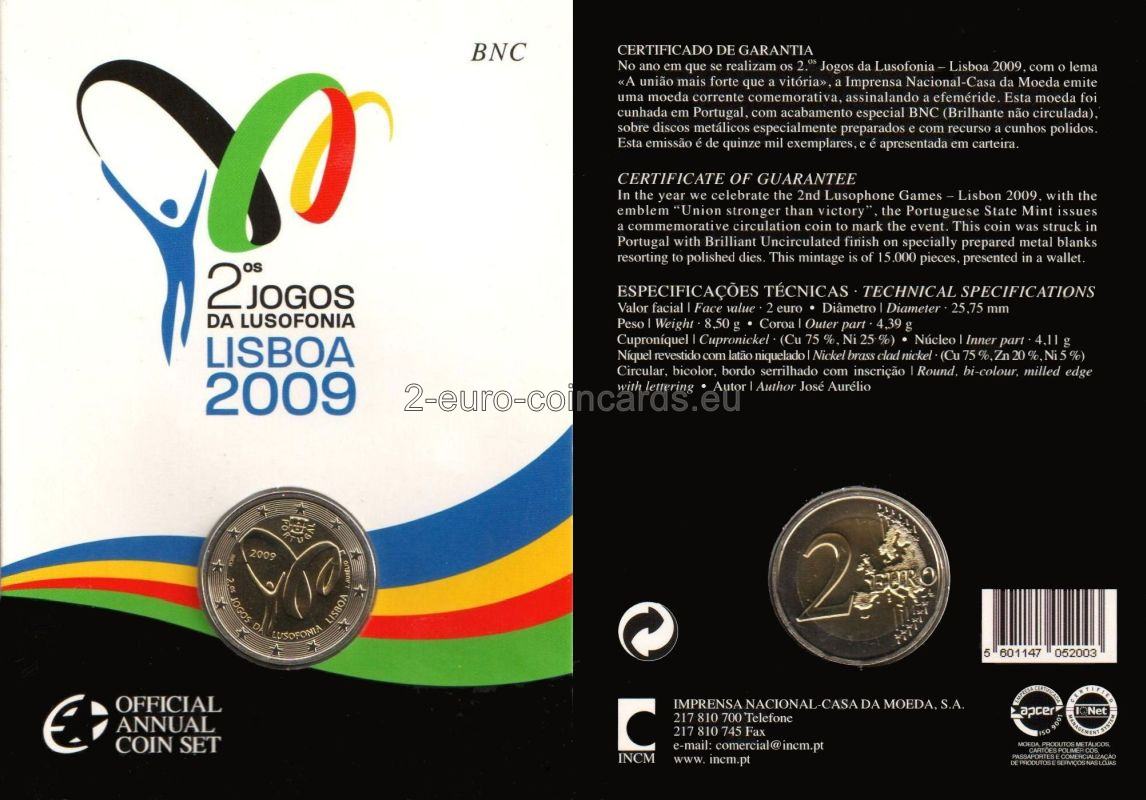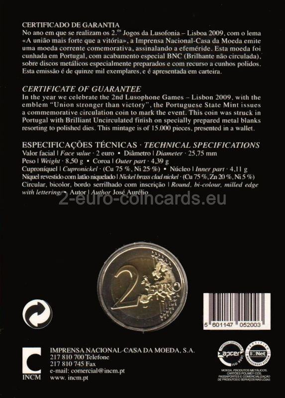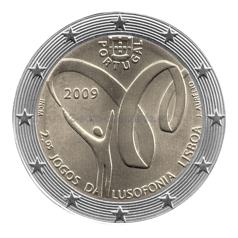 Vnútorná časť mince predstavuje gymnastu s farebnou stuhou oslavujúci víťazstvo. V hornej časti mince je vyobrazený štátny znak Portugalska, ktorý je umiestnený v polkruhu ohraničenom názvom vydávajúcej krajiny „PORTUGAL“. V dolnej časti mince je umiestnený nápis v tvare polkruhu „2. os JOGOS DA LUSOFONIA LISBOA“. Naľavo od nápisu je skratka Portugalskej mincovne Imprensa Nacional "INCM" a napravo meno umelca „J. AURÉLIO“. Nad hlavou športovca je uvedený rok vydania mince 2009.