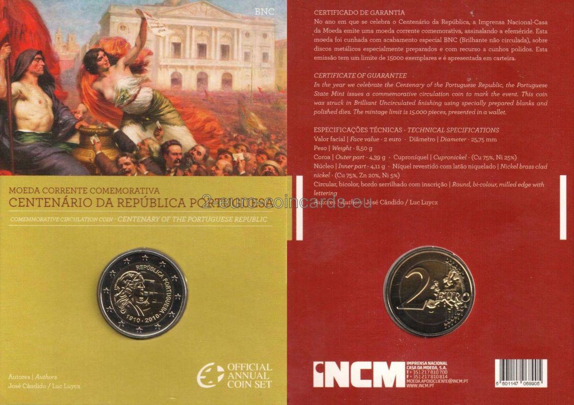 Minca pripomína 100. výročie pádu konštitučnej monarchie kráľa Manuela II. a vyhlásenie Portugalskej republiky po revolúcii z 5. októbra 1910. Na vnútornej časti mince je v strede zobrazený portugalský štátny znak a symbol „República“, čo sú dva najreprezentatívnejšie symboly Portugalskej republiky, okolo ktorých sa uvádza text „República Portuguesa – 1910 – 2010“, značka Portugalskej mincovne Imprensa Nacional "INCM" a meno autora „JOSE CÂNDIDO“.