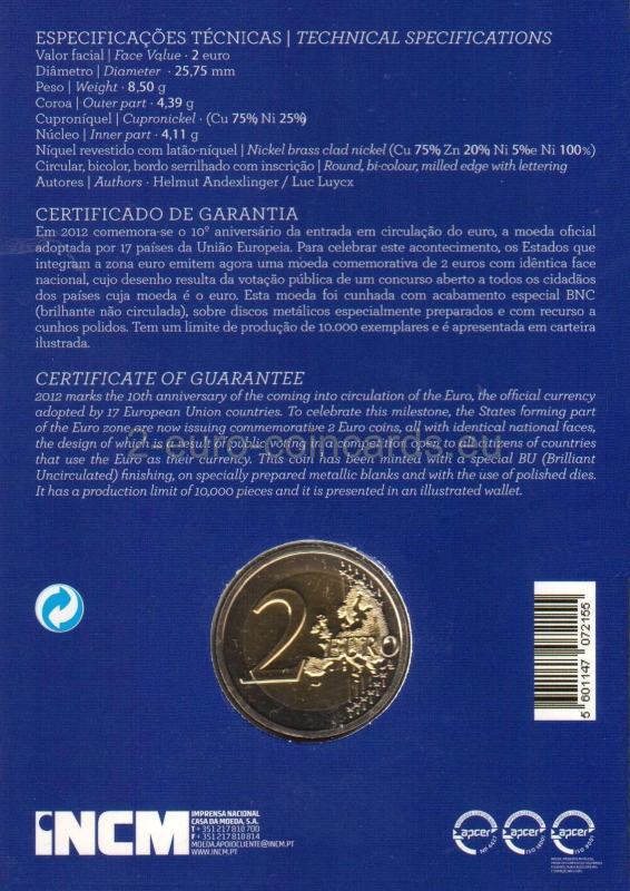 Znak eura v strede mince znamená, že euro sa stalo mimoriadne dôležitou súčasťou Európy, ale aj sveta, pretože sa v priebehu posledných 10 rokov stalo globálnym hráčom v rámci medzinárodného menového systému. Jednotlivé prvky motívu okolo symbolu eura na minci vyjadrujú význam eura pre ľudí, pre finančný svet (veža ECB), pre obchod (lode), priemysel (továrne), pre odvetvie energetiky, výskumu a vývoja (veterné elektrárne). Iniciály autora návrhu „A.H.“ sa dajú objaviť (ak sa pozriete veľmi pozorne) medzi loďou a budovou Eurotower. Pozdĺž horného okraja vnútornej časti mince je uvedená krajina vydania (PORTUGAL), zatiaľ čo označenie 2002 – 2012 je umiestnené v dolnej časti. Na pravej strane je zvislý znak Portugalskej mincovne Imprensa Nacional "INCM".