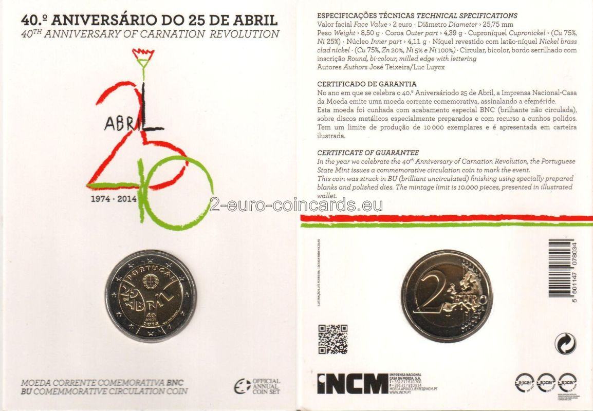 Dve krivky znázorňujú hrubý obrys karafiátu, kvetu, ktorý symbolizuje dané hnutie a z ktorého tiež vychádza názov revolúcie. Na hornej strane kvetu je vyrytý názov vydávajúcej krajiny „PORTUGAL“ a štátny znak. V strede motívu je uvedený dátum udalosti „25 DE ABRIL“ (25. apríla) a v dolnej časti počet rokov, ktoré od revolúcie uplynuli „40 ANOS“ (40 rokov) a rok vydania „2014“. Tvar písmen a číslic vychádza z tvaru, ktorý sa používal pred 40 rokmi na plagátoch a iných materiáloch s politickými informáciami, pričom má byť symbolom euforického obdobia, ktoré nasledovalo tesne po revolúcii. Značka Portugalskej mincovne Imprensa Nacional (INCM) a meno autora "JOSÉ TEIXEIRA" sú na pravom spodnom okraji.