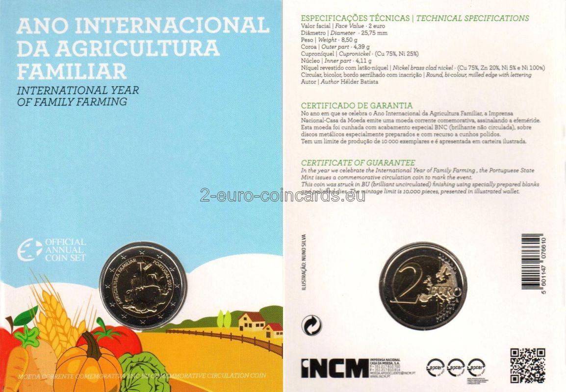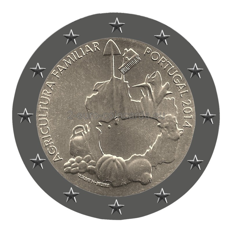 V strede motívu sú vyobrazené nástroje, ktoré sa bežne používajú v tradičnom poľnohospodárstve, spolu s poľnohospodárskymi produktmi: v strede kura obklopené tekvicami, košíkom zemiakov a inými druhmi zeleniny a kvetov. Na ľavej strane je v polkruhu uvedený pamätný motív „AGRICULTURA FAMILIAR“ (rodinné poľnohospodárstvo) a na pravej strane je v polkruhu uvedený názov vydávajúcej krajiny „PORTUGAL“ a za ním rok vydania „2014“. Vľavo dole je uvedená značka portugalskej mincovne Imprensa Nacional „INCM“ a meno autora "H. BATISTA".