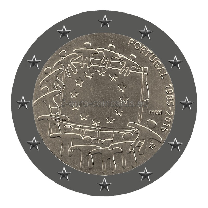 Vzor zobrazuje vlajku EÚ ako symbol, ktorý spája ľudí a kultúry s rovnakými víziami a ideálmi lepšej spoločnej budúcnosti. Dvanásť hviezd, ktoré sa menia na ľudské postavy, predstavuje zrodenie novej Európy. Vpravo hore je v polkruhu uvedený názov vydávajúcej krajiny „PORTUGAL“ a roky „1985 – 2015“. Vpravo dolu sa nachádzajú iniciály umelca Georgiosa Stamatopoulosa "ΓΣ".