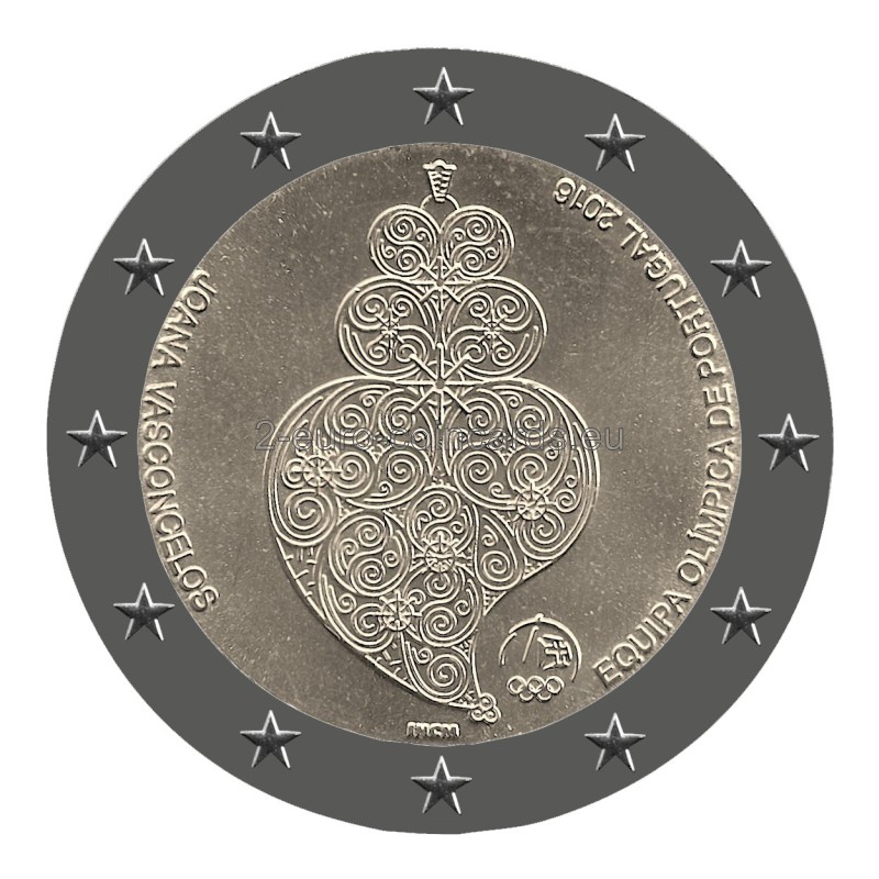 Na návrhu je zobrazené známe umelecké dielo podpísané autorkou Joannou Vasconcelos nazvané „Srdce z Viany“, ktoré je inšpirované tradičnými klenotmi zo severného Portugalska (v okolí mesta Viana do Castelo). Symbolizuje podporu Portugalcov ich národnému tímu pri príležitosti olympijských hier. Na ľavej strane je do polkruhu uvedené meno autora „JOANA VASCONCELOS“ a na pravej strane „EQUIPA OLÍMPICA DE PORTUGAL 2016“ (PORTUGALSKÝ OLYMPIJSKÝ TÍM 2016). Dole je uvedená značka Portugalskej mincovne Imprensa Nacional „INCM“.