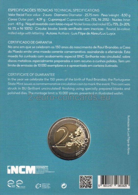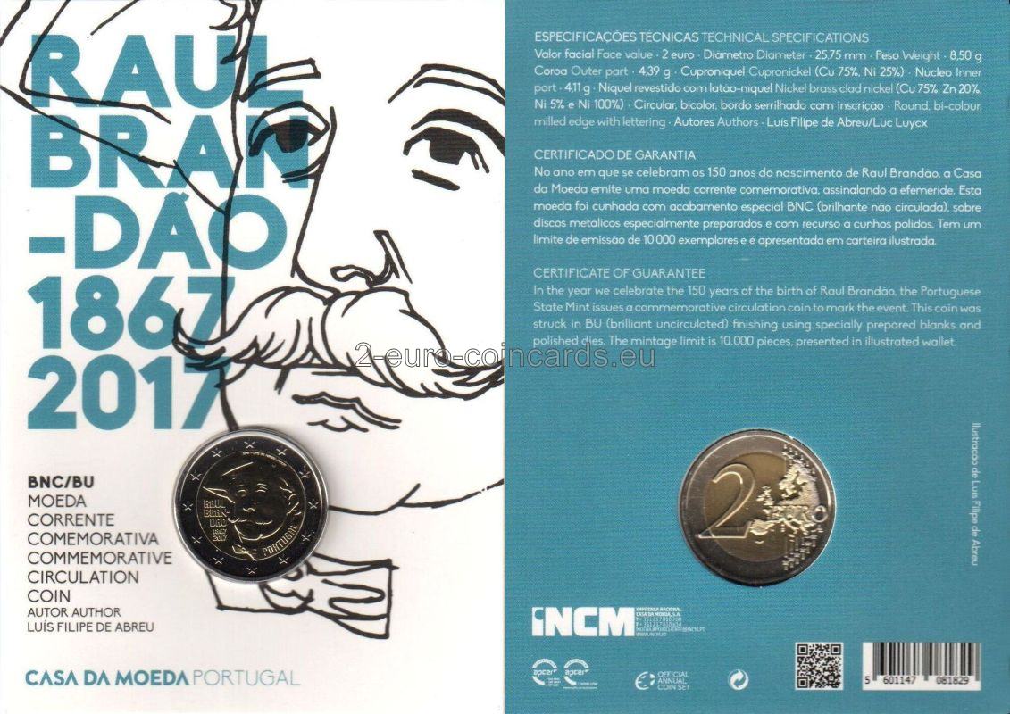 Motív znázorňuje tvár Raúla Brandãa. Na ľavej strane sa nachádza nápis RAÚL BRANDÃO a pod ním roky „1867“ a „2017“. Vpravo dole je uvedený nápis vydávajúcej krajiny „PORTUGAL“ a vpravo hore je zobrazené meno autora „LUIS FILIPE DE ABREU“, po ktorom nasleduje značka Portugalskej mincovne Imprensa Nacional „INCM“.