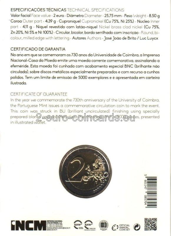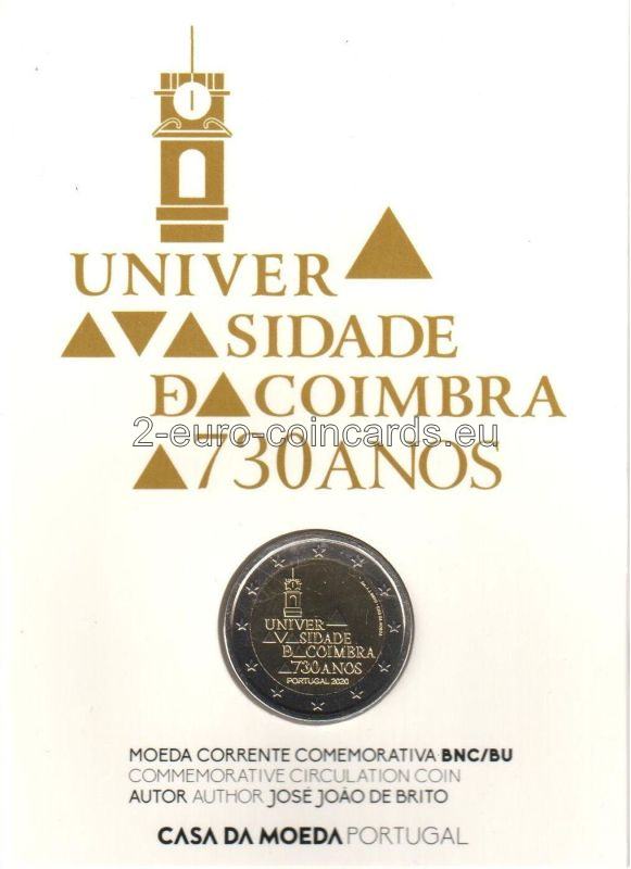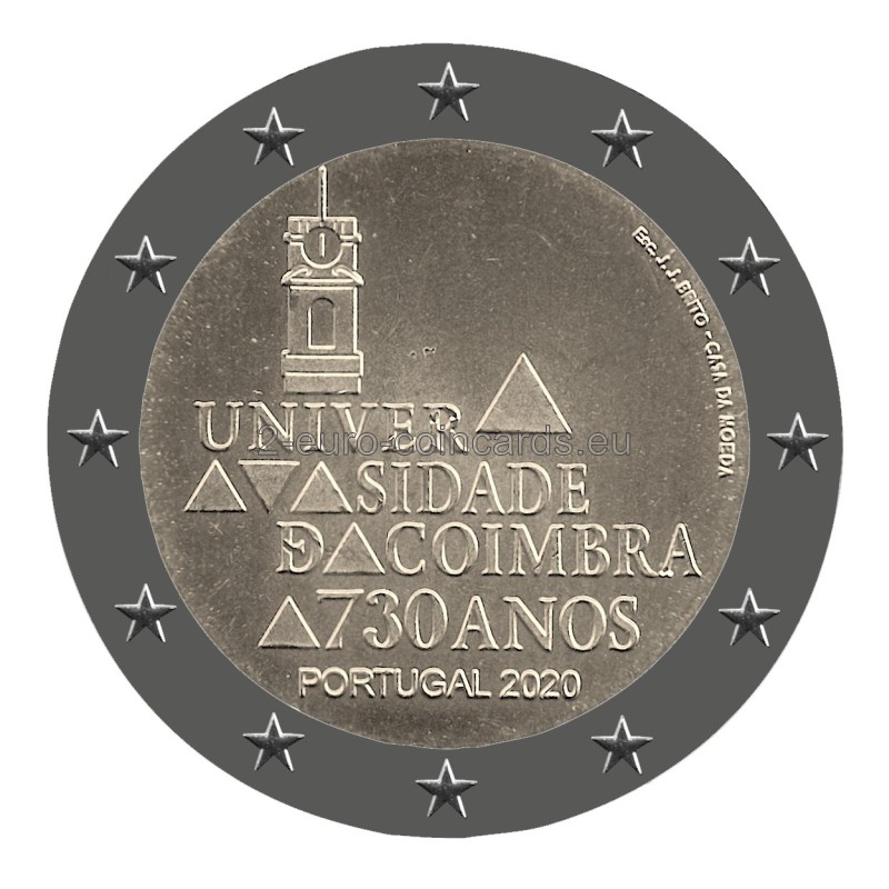 Na vzore je vyobrazená veža Univerzity v Coimbre a kompozícia trojuholníkov predstavujúcich strechy Univerzity v Coimbre, pričom najvyšší trojuholník znázorňuje knižnicu Joanina, spolu s nápisom „UNIVERSIDADE DE COIMBRA 730 ANOS PORTUGAL 2020“ (v preklade UNIVERZITA V COIMBRE 730 ROKOV PORTUGALSKO 2020). Vpravo hore je podpis autora mincovne "Esc.J.J. BRITO" a označenie mincovne "Casa da Moeda".