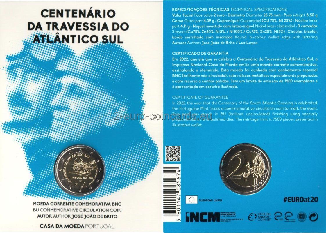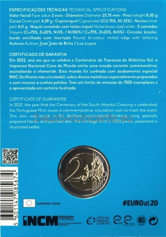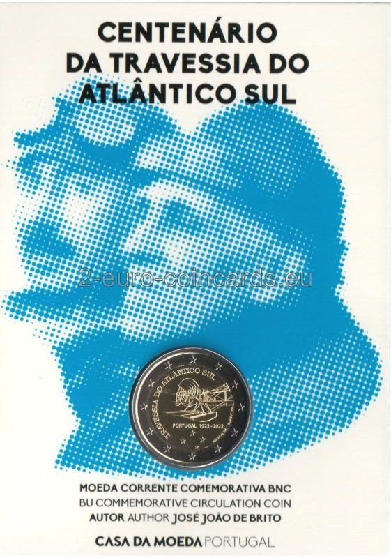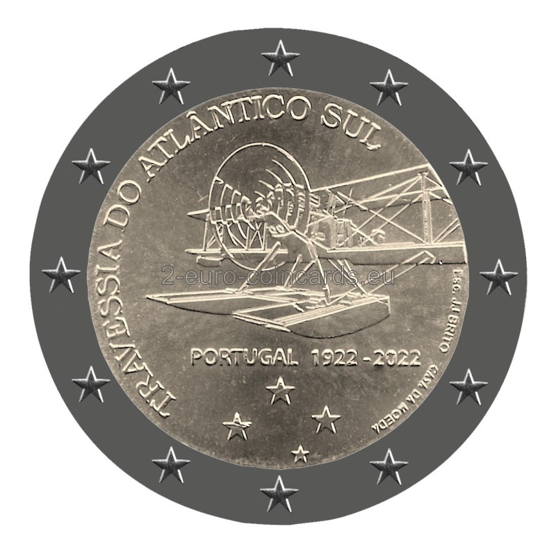 Na vzore je vyobrazený jeden z troch dvojplošníkov Fairey III, ktoré sa použili na uskutočnenie letu medzi Lisabonom a Rio de Janeirom. Na okraji je uvedený nápis „TRAVESSIA DO ATLÂNTICO SUL“ (PRELET PONAD JUŽNÝM ATLANTIKOM). Pod lietadlom je nápis „PORTUGAL 1922 – 2022“. Na pravom okraji je uvedené meno autora mincovne "Esc. JJ BRITO" a označenie mincovne "CASA DA MOEDA".