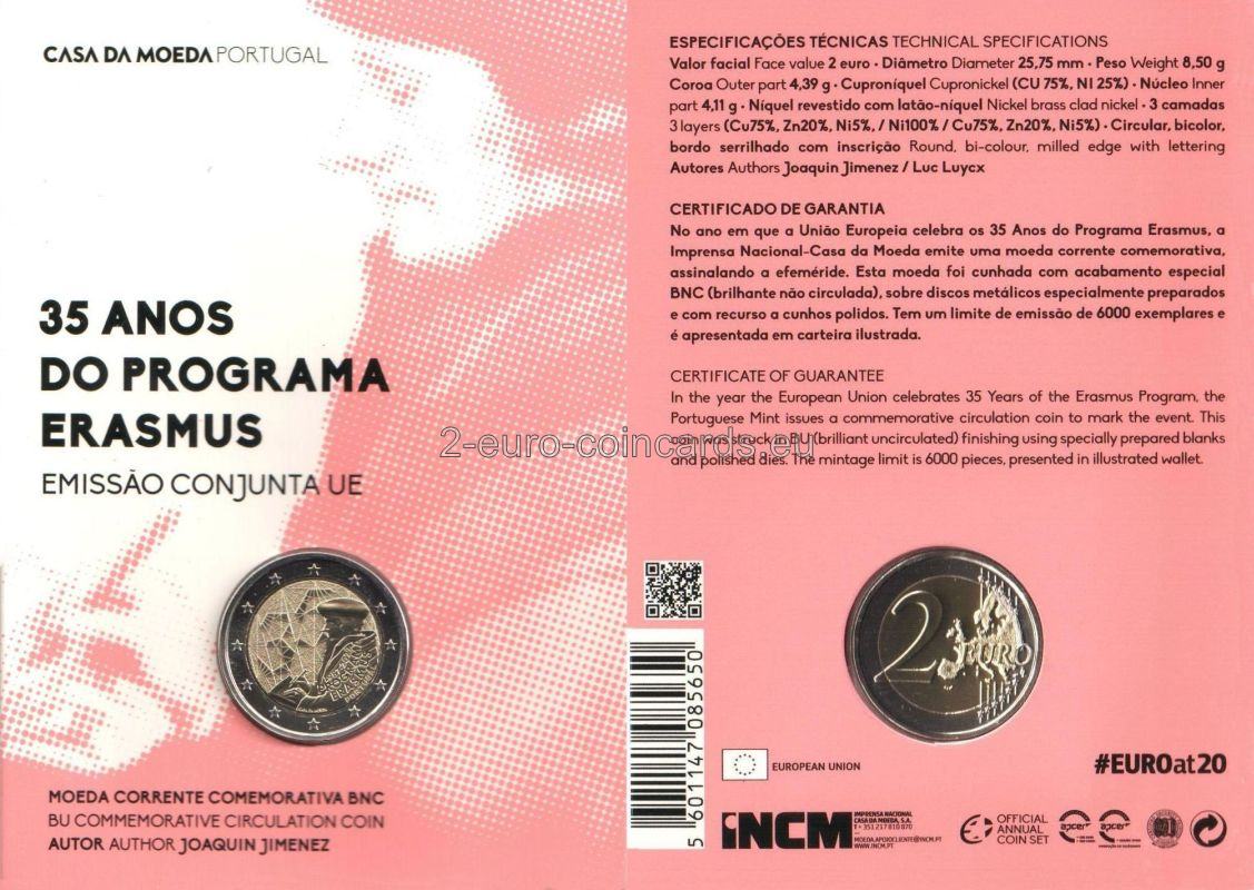 Návrh je kombináciou dvoch hlavných prvkov programu Erasmus: pôvodná intelektuálna inšpirácia, samotný Erasmus a alegória jeho vplyvu na Európu. Prvú symbolizuje jedno z najznámejších vyobrazení Erasma. Druhý je symbolizovaný zväzkom lúčov predstavujúcim väzby, ktoré prechádzajú naprieč mincou od jedného svetelného zdroja k druhému a reprezentujú množstvo intelektuálnych a ľudských výmen medzi európskymi študentkami a študentmi. Ako odkaz na Európu niektoré z týchto lúčov tvoria iné hviezdy, ktoré vznikli vďaka synergiám medzi krajinami. Medzi líniami sú tiež iniciály autora mince "J.J." (Joaquin Jimenez). Číslo 35, zodpovedajúce tridsiatemu piatemu výročiu, vystupuje z hviezd v modernom grafickom štýle. V spodnej časti je značka mincovne "CASA DA MOEDA".