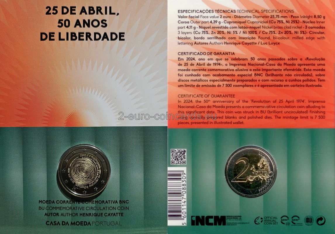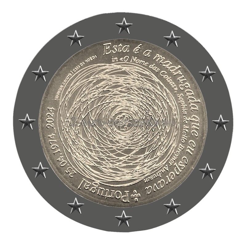 V strede národnej strany mince je karafiát symbolizujúci revolúciu, obklopený mnohými excentrickými kruhmi, ktoré naznačujú, že činy a presvedčenia ľudí sa môžu v priebehu rokov meniť, ale v podstate zostávajú verné princípom revolúcie. Na pravom okraji je verš „Esta é a madrugada que eu esperava“ (Toto je úsvit, na ktorý som čakala) a meno jeho autorky, poetky Sophii de Mello Breiner Andresen; vľavo je uvedené meno autora návrhu a značka portugalskej mincovne "Casa da Moeda".