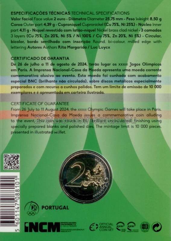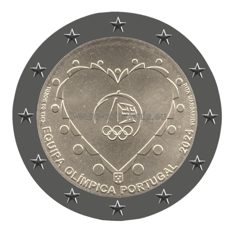 Na národnej strane mince je súbor prvkov v tvare srdca, symbolizujúcich kolektívne objatie; okolo srdca je 15 kruhov symbolizujúcich olympijské kruhy a kontinenty, ktoré predstavujú, špička srdca je korunovaná erbom Portugalska; V strede "objatia" je logo Portugalského olympijského výboru, ktoré vyjadruje myšlienku, že srdcia Portugalcov budú kolektívne biť pre portugalský olympijský tím na olympijských hrách v Paríži 2024. Nižšie je uvedený názov "Equipa Olímpica Portugal". a rok "2024"; Vľavo je značka mincovne "Casa da Moeda" a vpravo meno autora návrhu. Špeciálna verzia s povrchovou úpravou Proof bude mať farebné prvky.