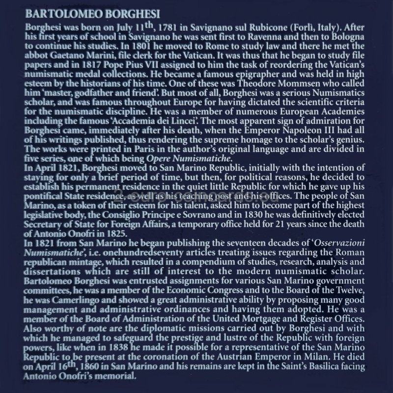 Taliansky vedec Bartolomeo Borghesi bol kľúčovou osobnosťou pri formovaní numizmatiky ako vedy. Borghesi sa narodil 11. júla 1781 v Savignano sul Rubicone pri Rimini. Bol to nadaný chlapec, už ako 9-ročný písal grécky a latinsky. Ako 11-ročný vypracoval prácu o bronzovej medaile cisára Herakleia. Sláva mladého talentu sa rozšírila aj do jeho rodného mesta. Hoci sa dá predpokladať, že jeho prvé práce ovplyvnil jeho otec, uznávaný numizmatik. Po otcovej smrti v roku 1794 bol Borghesi poslaný pokračovať v štúdiu do Ravenny a Bologne, kde sa venoval filozofii a filológii. Neskôr pokračoval v štúdiu v Ríme, kde pre pápeža Pia VII katalogizoval niekoľko numizmatických zbierok vrátane vatikánskej zbierky. Okrem toho začal jednu zo svojich najvýznamnejších prác - v rokoch 1818 - 1820 zbieral nápisy na antických minciach a dešifroval ich. Vzniklo tak monumentálne dielo "Nuovi Frammenti dei Fasti Consolari Capitolini", ktorým si získal úctu vedcov na celom svete a ktoré poslúžilo ako základ pre chronológiu rímskych dejín. Bartolomeo Borghesi bol členom mnohých európskych akadémií. V roku 1821 sa Borghesi kvôli nepokojnej politickej situácii v krajine presťahoval do San Marína. Po získaní nového občianstva zastával rôzne verejné funkcie vrátane štátneho tajomníka pre zahraničné veci, člena verejnej univerzity, štátneho pokladníka a člena Rady dvanástich. Mal aj rôzne úlohy ako veľvyslanec. V San Maríne začal Borghesi vydávať 17 zväzkov svojich Osservazioni numismatiche (Numizmatické poznámky). Uverejnil tiež 170 článkov o razbe mincí v Rímskej republike. Tieto práce majú pre vedeckú numizmatiku veľký význam aj dnes. V roku 1838 ho zástupca Sanmarínskej republiky pozval do Milána na korunováciu Ferdinanda I. za lombardsko-benátskeho kráľa. Pod Borghesiho vedením vzniklo Sanmarínske múzeum so zbierkou obrazov, archeologických nálezov, keramiky a sôch. Borghesi bol jedným z autorov ambiciózneho projektu, zbierky všetkých latinských nápisov antického sveta. Dielo vzniklo pod záštitou Berlínskej akadémie vied a dostalo názov Corpus Inscriptionum Latinarum. Vydávanie nových zväzkov stále prebieha. Borghesi zomrel 16. apríla 1860 a bol pochovaný vo Svätej bazilike. Zanechal po sebe veľké množstvo vedeckých prác, ktoré sú dodnes aktuálne, a žiakov, ktorí pokračovali v jeho vedeckom výskume. Po Borghesiho smrti Napoleon III. ako uznanie jeho veľkého vedeckého prínosu nariadil vydať kompletné vydanie učencových prác. Toto vydanie v desiatich zväzkoch sa začalo v roku 1862 a bolo dokončené až v roku 1897.