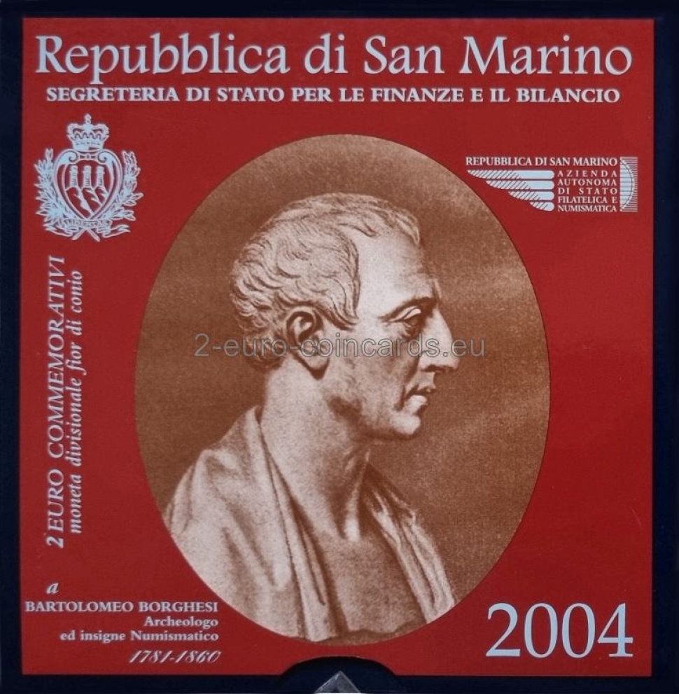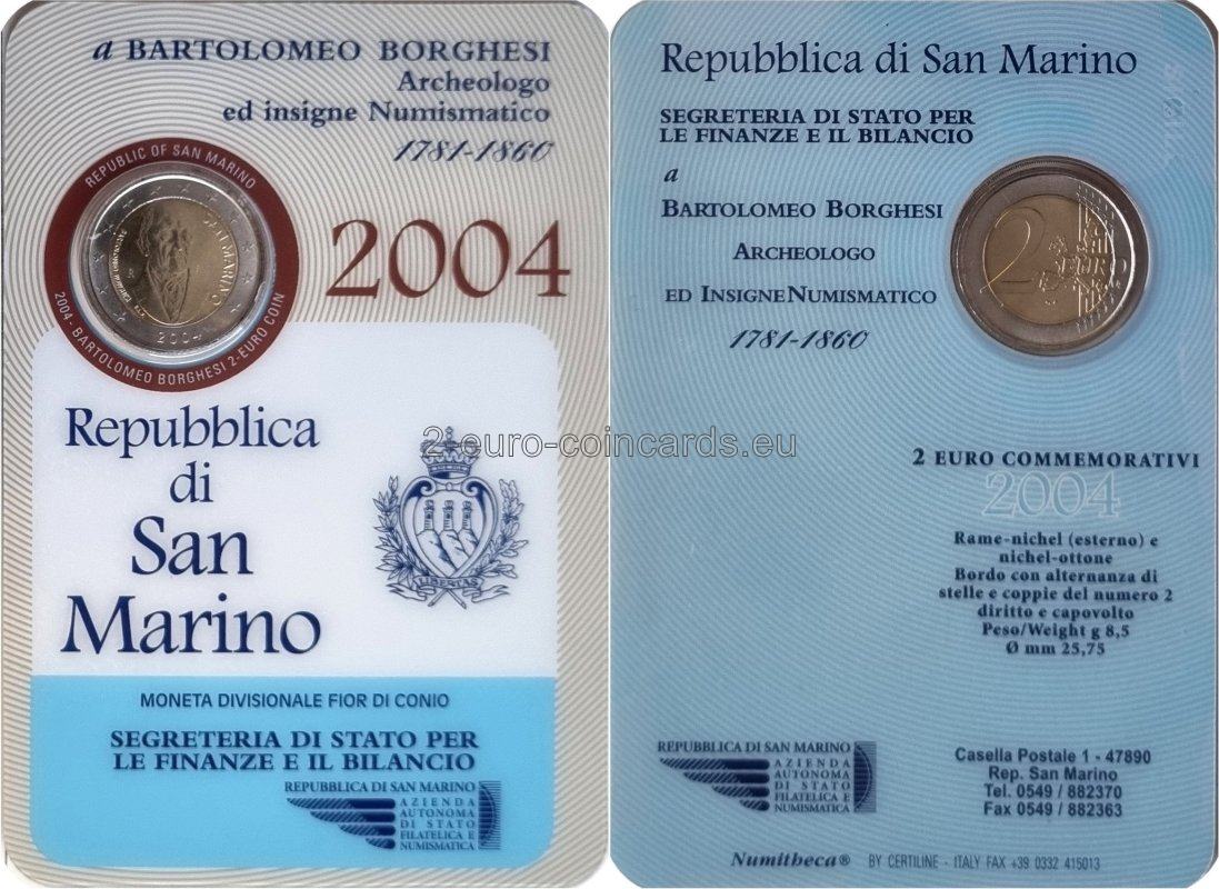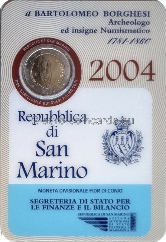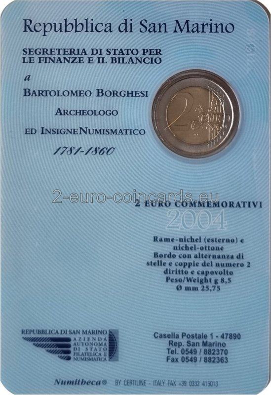 V strede vnútorného disku je portrét Bartolomea Borgesiho. Na ľavej strane je písmeno mincovne "R", meno učenca "BARTOLOMEO BORGHESI" je napísané pozdĺž ľavého okraja disku a je tu aj označenie umelca ("E.L.F."). Pri pravom okraji je uvedený názov vydávajúceho štátu "SAN MARINO". V strede v spodnej časti je rok vydania „2004“.