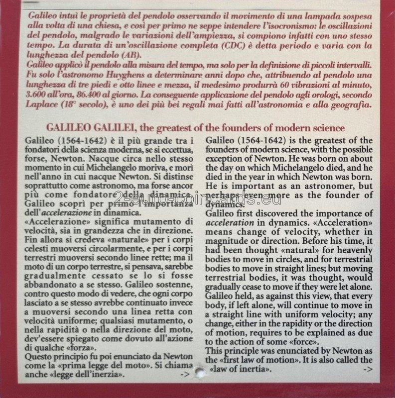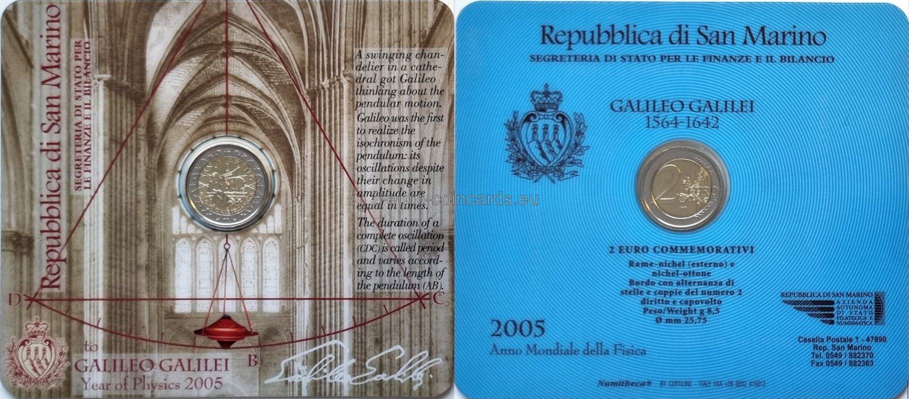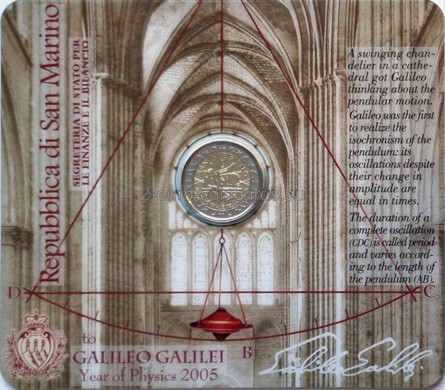 Rok 2005 vyhlásilo Valné zhromaždenie OSN za Medzinárodný rok fyziky (rezolúcia 58/293 z 10. júna 2004). Pripomínalo sa ním 100. výročie publikovania vedeckej práce Alberta Einsteina (1879 - 1955) v roku 1905, ktorá položila základy troch dôležitých odvetví fyziky: teórie relativity, kvantovej teórie a teórie Brownovho pohybu. Tieto práce dali impulz, krok od klasickej mechaniky ku kvantovej elektronike, laserovej fyzike a ďalším odvetviam modernej fyziky, na ktorých je založený najnovší vývoj vo všetkých oblastiach ľudskej činnosti. V rámci Medzinárodného roka fyziky sa konali najrôznejšie výstavy, súťaže a demonštrácie. Ich cieľom bolo pomôcť pochopiť modernú úlohu fyziky pri tvorbe väčšiny už existujúcich technológií a pri riešení takých dôležitých problémov, ako je hľadanie nových zdrojov energie, ochrana životného prostredia a zdravia ľudí. Koniec koncov, vedu je potrebné priblížiť a ľahšie pochopiť miliónom ľudí na celom svete. Jedným z cieľov Medzinárodného roka fyziky bolo vzbudiť pochopenie významu vedeckých poznatkov v modernej spoločnosti. Zapojiť mladých ľudí do vedy, do najnovších objavov a úspechov, objaviť ich priekopnícky talent pre nové technológie. Veď fyzika zohráva dôležitú úlohu nielen v rozvoji vedy a techniky, ale má aj obrovský vplyv na našu spoločnosť. Minca je venovaná talianskému filozofovi, fyzikovi, astronómovi, matematikovi obdobia renesancie, jeden zo zakladateľov súčasnej experimentálno-teoretickej prírodovedy Galieo Galileovi. Prvý v histórii rozpracoval teóriu kyvadiel. Dokázal, že perióda závisí iba od dĺžky, nie od amplitúdy alebo hmotnosti kyvadla.