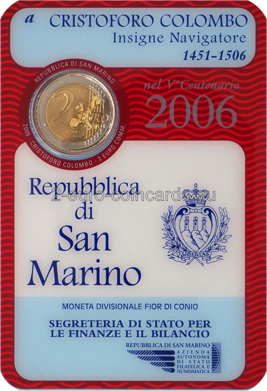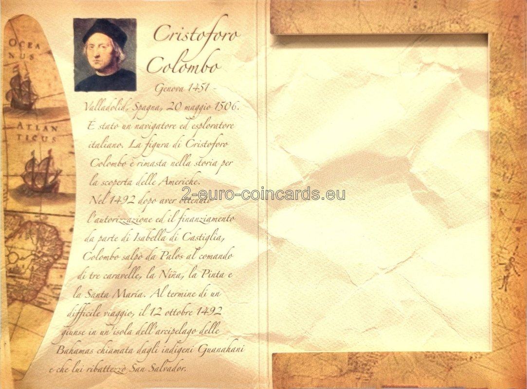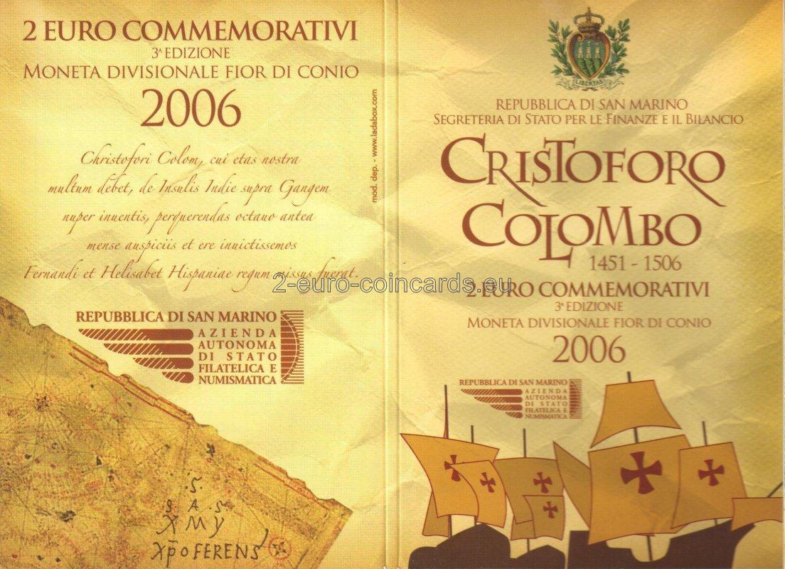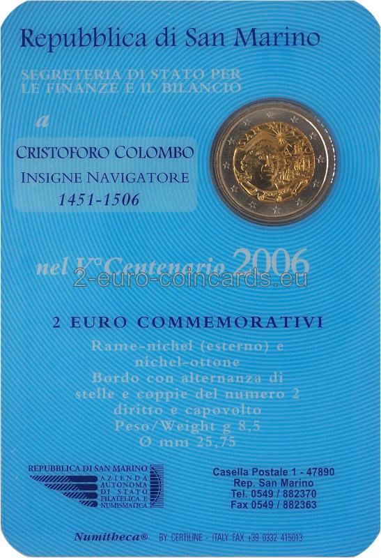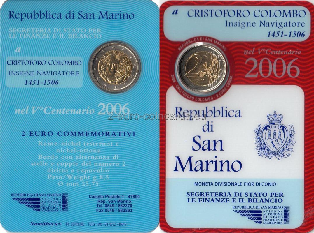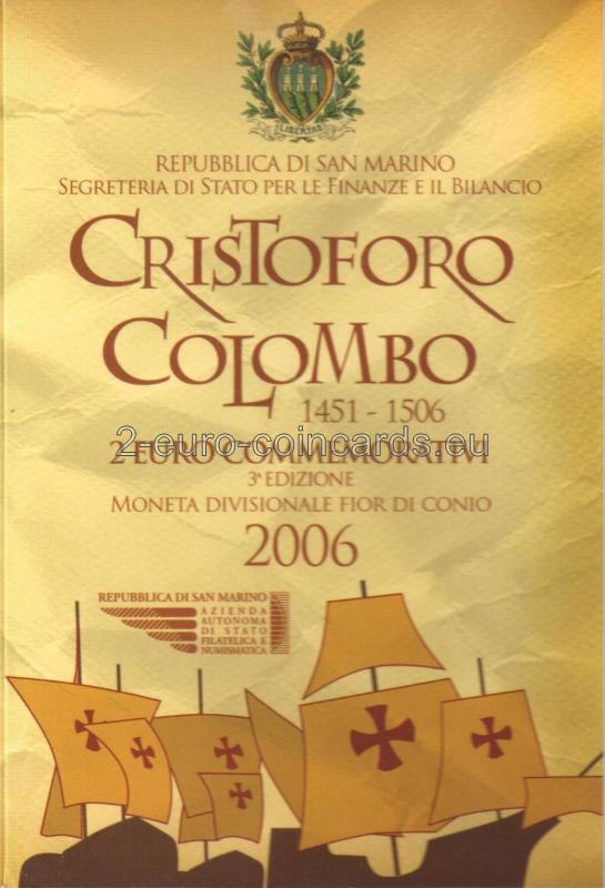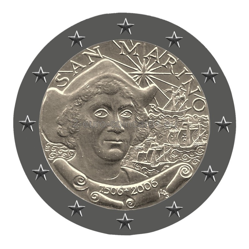 Minca zobrazuje portrét Krištofa Kolumba aa znázornenie troch karavel; nad portrétom nápis „SAN MARINO“ a veterná ružica; v strede značka mincovne „R“; pod ním dátumy „1506 – 2006“ v kartuši a iniciály autora Luciana De Simoni „LDS“.