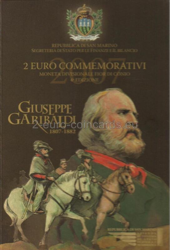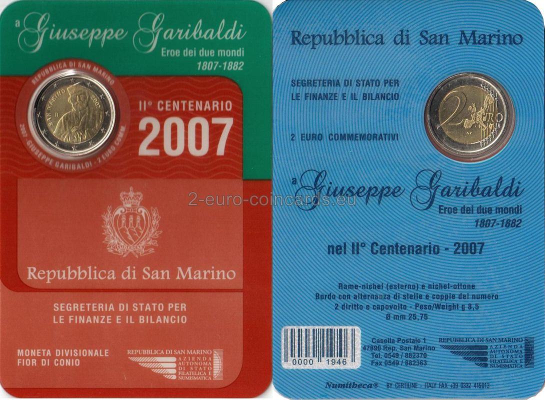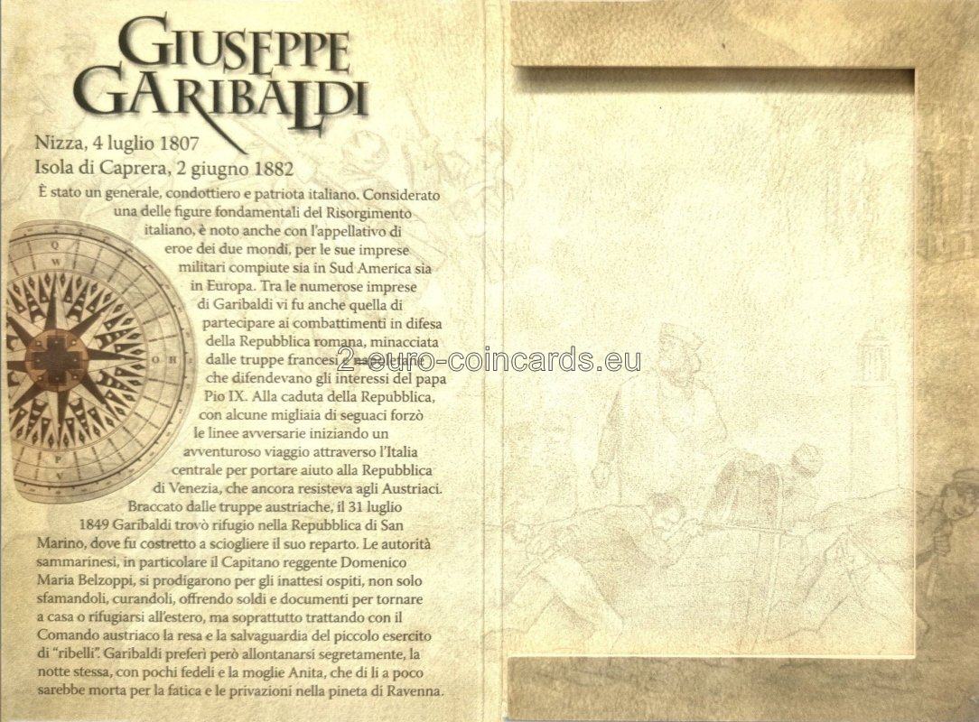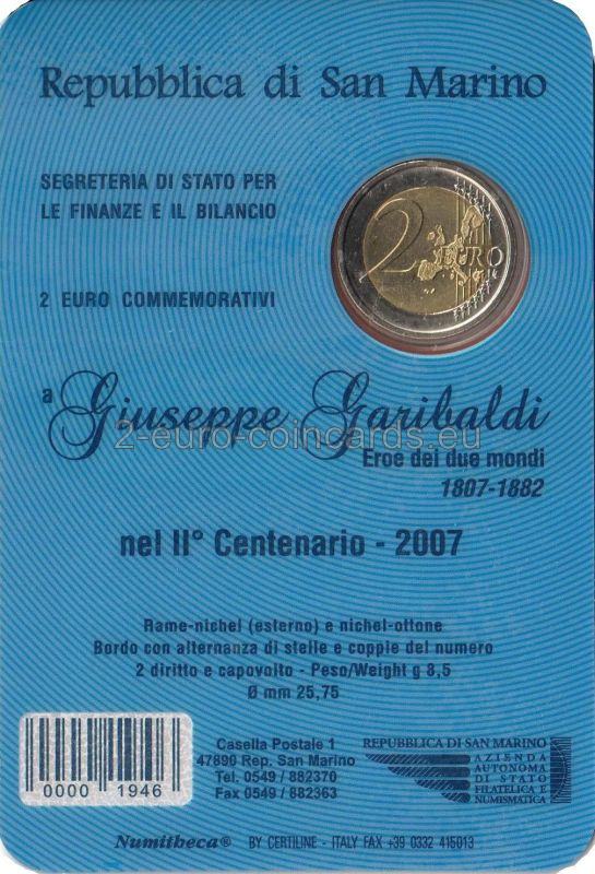 Vo vnútornom kruhu mince je vyobrazený portrét Giuseppeho Garibaldiho. Pozdĺž kruhu je na ľavej strane vyrytý nápis „SAN MARINO“ a na pravej strane označenie roka „2007“. Značka mincovne „R“ a iniciály autora Ettore Lorenzo Frapiccini „E.L.F.“ sa nachádzajú na ľavej strane vnútorného kruhu.