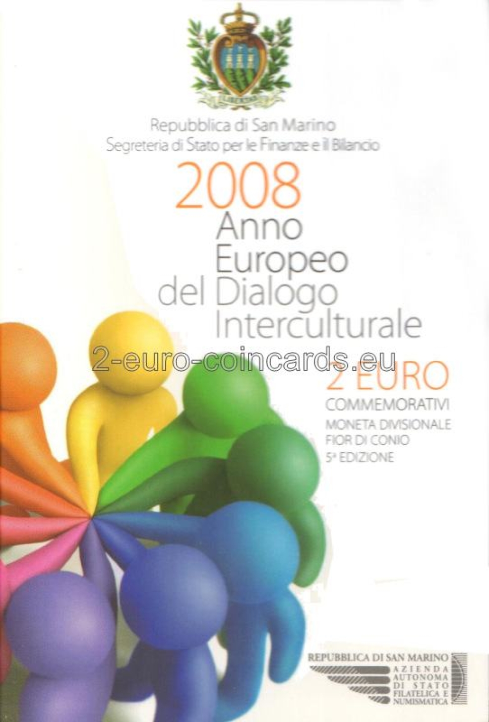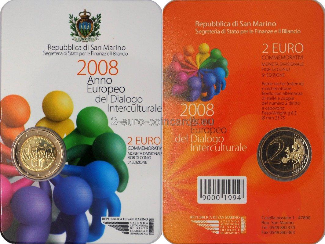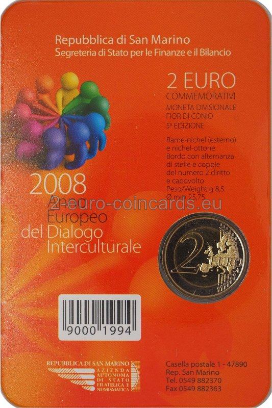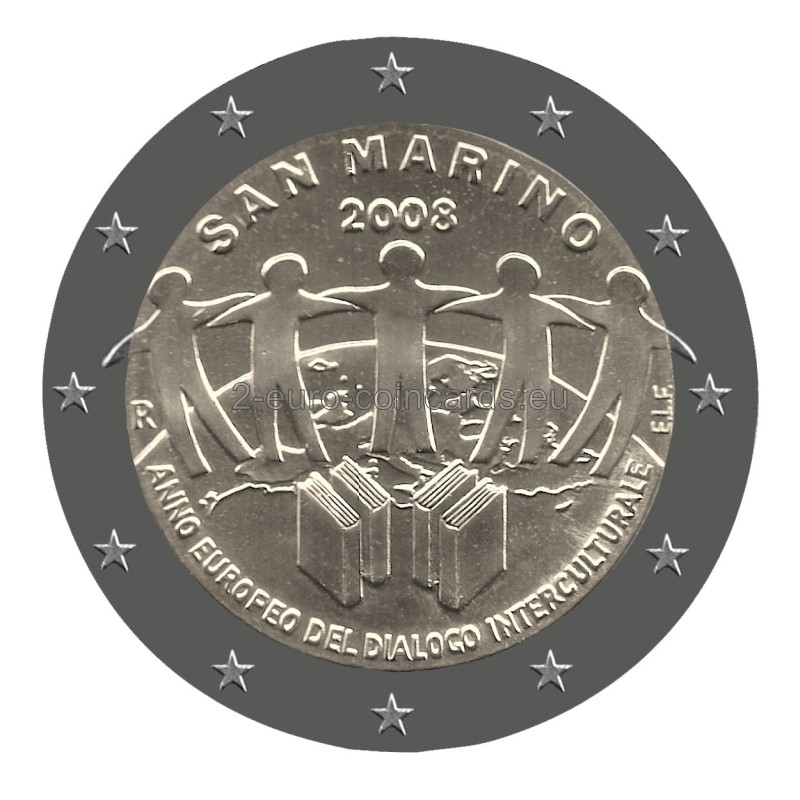 Na vnútornom disku je päť ľudských postáv na zemeguli, ktoré symbolizujú kultúry piatich kontinentov žijúcich v Európe. V popredí sú posvätné texty štyroch náboženstiev v podobe kníh. Nad obrazom je názov vydávajúcej krajiny "SAN MARINO" a pod ním rok vydania "2008". V spodnej časti je polkruhový text: "ANNO EUROPEO DEL DIALOGO INTERCULTURALE" ("EURÓPSKY ROK INTERKULTÚRNEHO DIALÓGU", it.). Vľavo je značka mincovne (písmeno "R"), vpravo značka umelca (iniciály "E.L.F.").