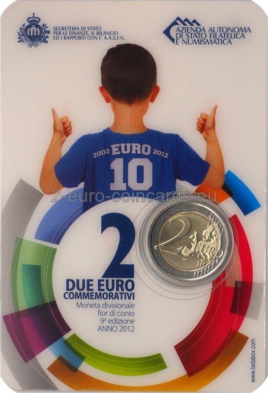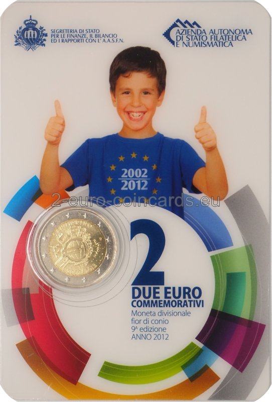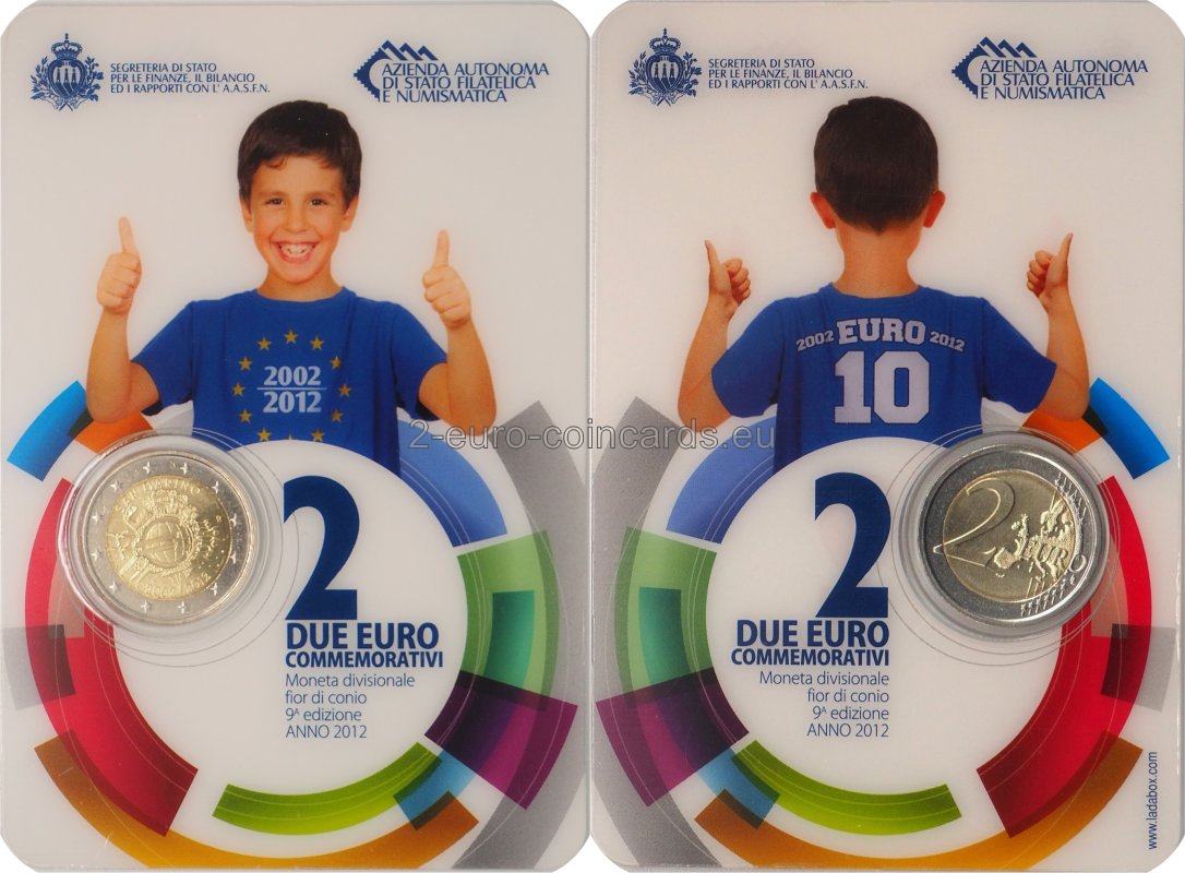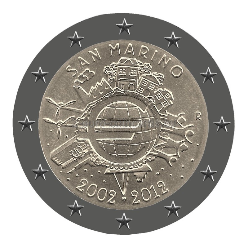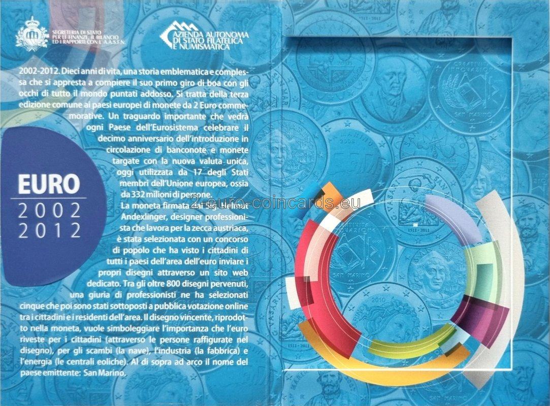 Znak eura v strede mince znamená, že euro sa stalo mimoriadne dôležitou súčasťou Európy, ale aj sveta, pretože sa v priebehu posledných 10 rokov stalo globálnym hráčom v rámci medzinárodného menového systému. Jednotlivé prvky motívu okolo symbolu eura na minci vyjadrujú význam eura pre ľudí, pre finančný svet (veža ECB), pre obchod (lode), priemysel (továrne), pre odvetvie energetiky, výskumu a vývoja (veterné elektrárne). Iniciály autora návrhu „A.H.“ sa dajú objaviť (ak sa pozriete veľmi pozorne) medzi loďou a budovou Eurotower. Pozdĺž horného okraja vnútornej časti mince je uvedená krajina vydania (SAN MARINO), zatiaľ čo označenie 2002 – 2012 je umiestnené v dolnej časti.