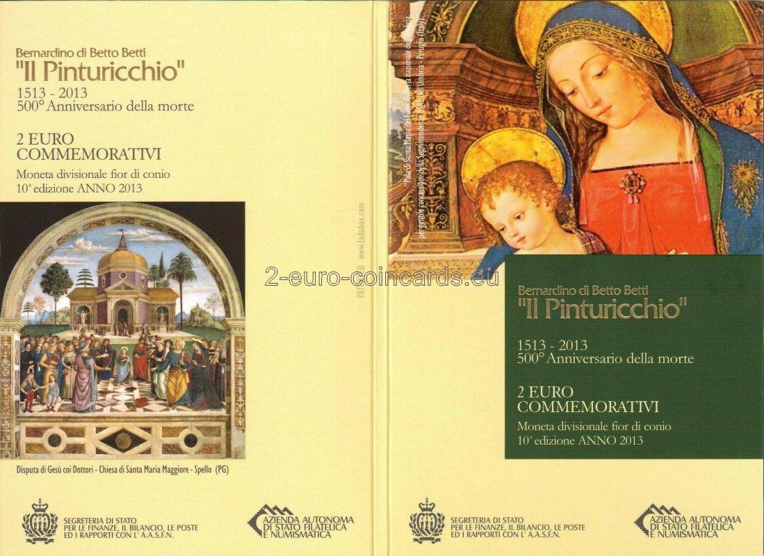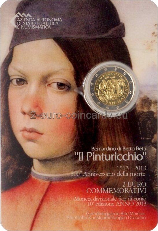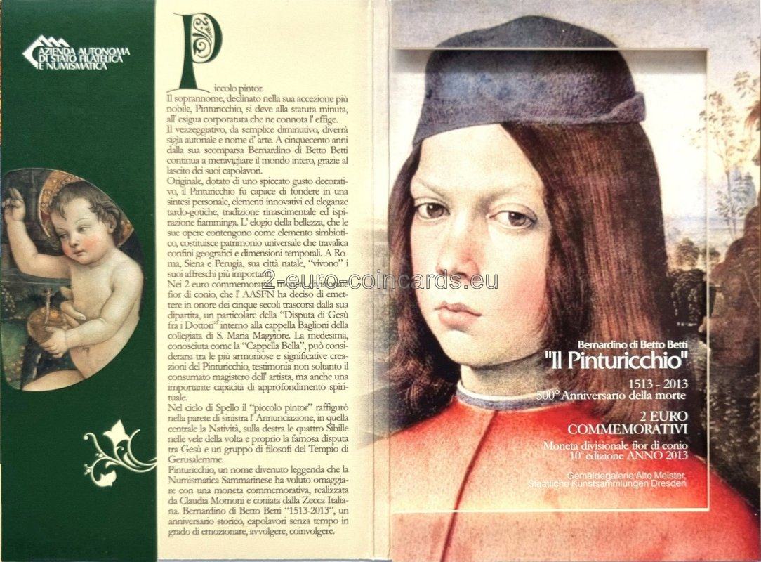 V popredí je znázornená freska „Ježiš v rozprave s učencami“, v spodnej časti je v polkruhu uvedený nápis „SAN MARINO“, vľavo sa nachádza značka talianskej mincovne „R“. Pod freskou je meno autorky návrhu „MOMONI“, nad freskou je v polkruhu uvedený nápis „PINTURICCHIO“ a pod ním roky „1513“ a „2013“.