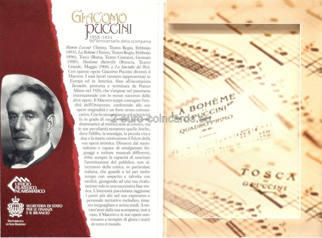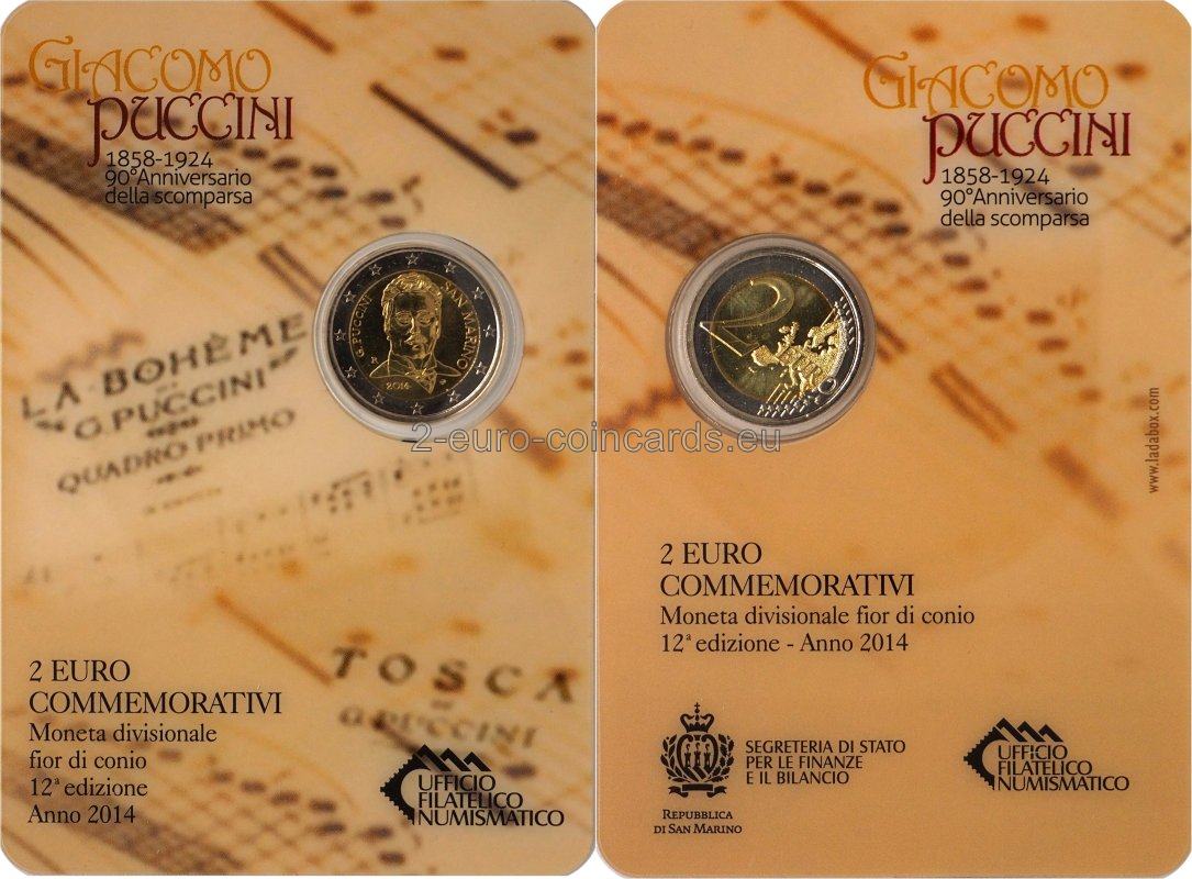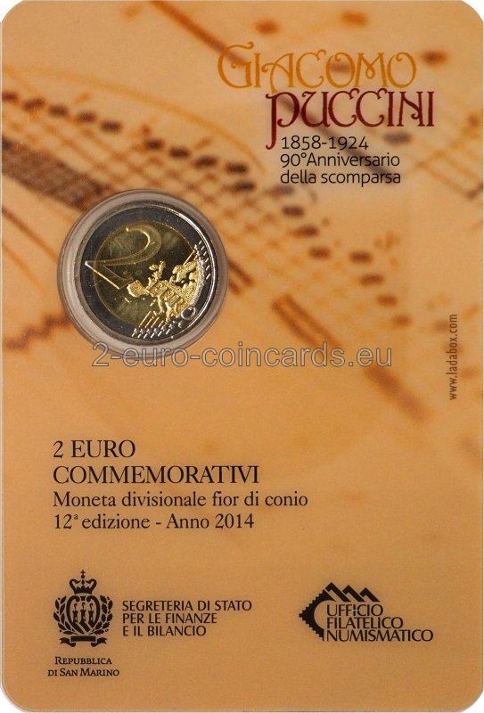 Na vnútornom disku je portrét G. Pucciniho podľa známej fotografie z roku 1900. V pravej časti je v polkruhu uvedený názov vydávajúcej krajiny „SAN MARINO“. V ľavej časti je uvedený nápis „G. PUCCINI“ a značka mincovne "R". V spodnej časti je uvedený rok „2014“ a vpravo iniciály autora "UP".